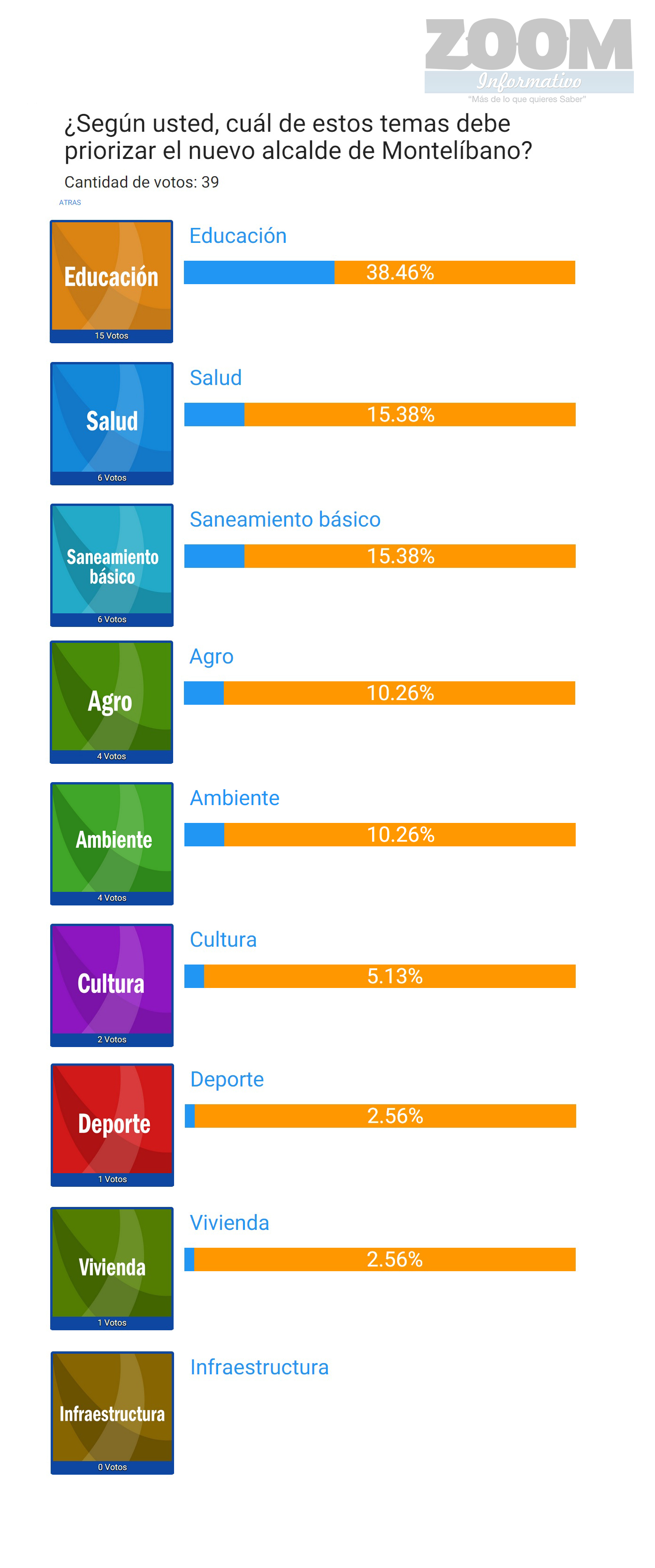 Publicamos los resultados de la encuesta política Zoom, la misma es realizada y financiada 100% por el periódico Zoom Informativo, es importante recordar a nuestro amigos, seguidores, lectores y aspirantes, que en esta encuesta no existe un diseño, técnico de muestra, ni es posible calcular un margen de error por tal motivo, Zoom, le informa que no se trata de una encuesta técnicamente diseñada. La misma fue realizada on line, con la pregunta ¿Según usted, cuál de estos temas debe priorizar el nuevo alcalde de Montelíbano?.
