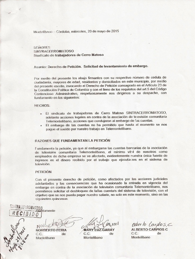 Trabajadores de Telemontelíbano presentaron un derecho de petición ante la organización sindical Sintracerromatoso, con el propósito que esta organización sindical tenga en cuenta la situación de los empleados.