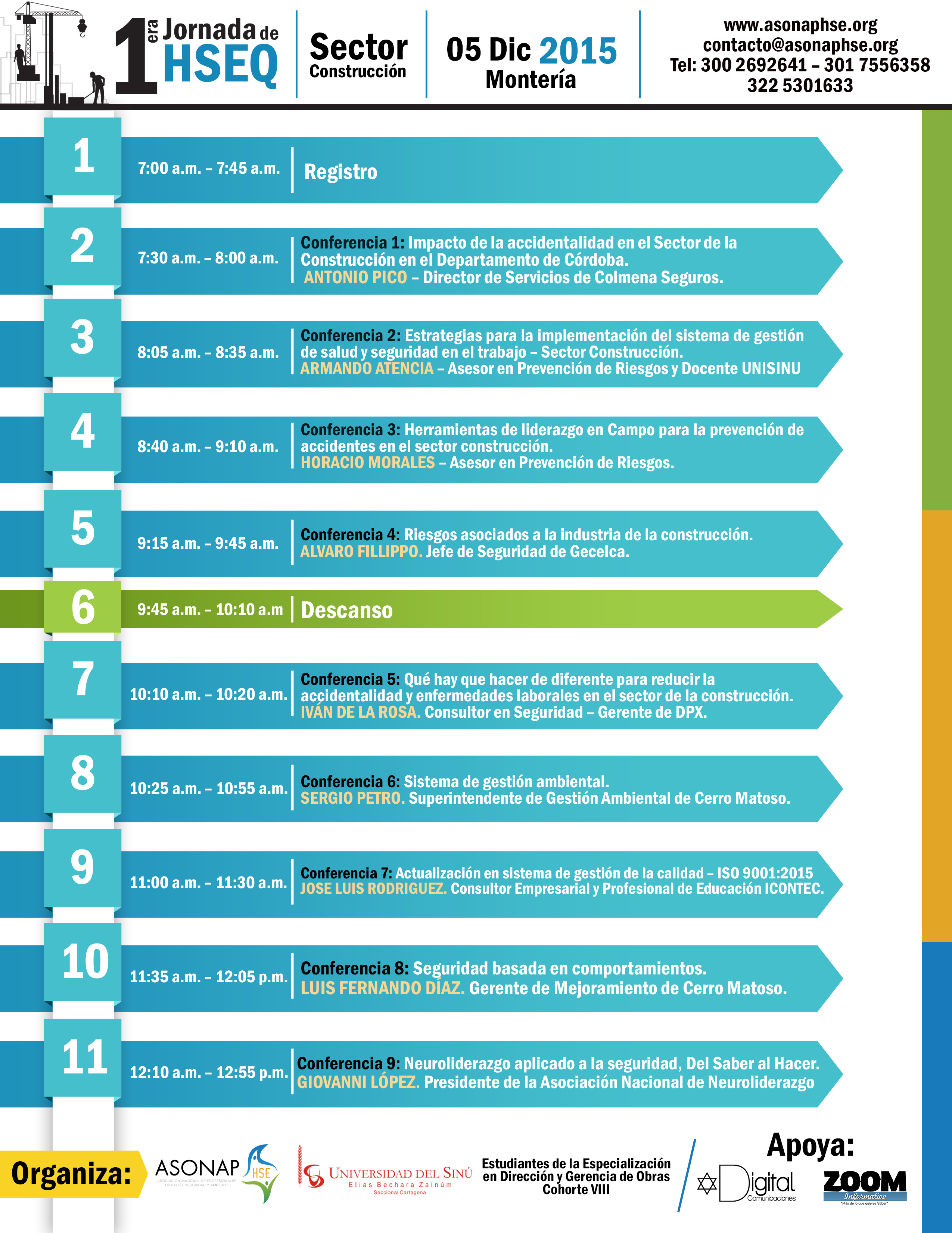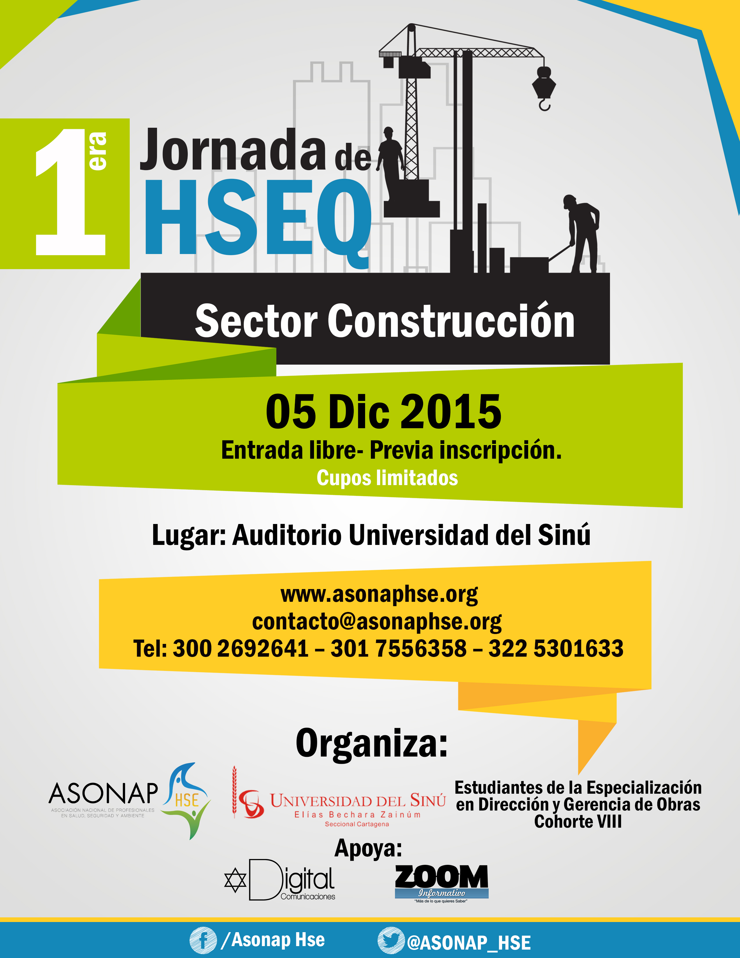 ASONAP HSE y los estudiantes de la especialización en dirección y gerencia de obras de la universidad del SINU, estarán realizando la 1era Jornada HSEQ, abordando temas específicos para el sector construcción, esta jornada se llevara a cabo con el objetivo que los asistentes aprendan y/o amplíen su conocimientos de para plantear soluciones que permitan a sus empresas no caer en estadística de accidentalidad pero sobre todo ayuden a salvar vidas humanas.