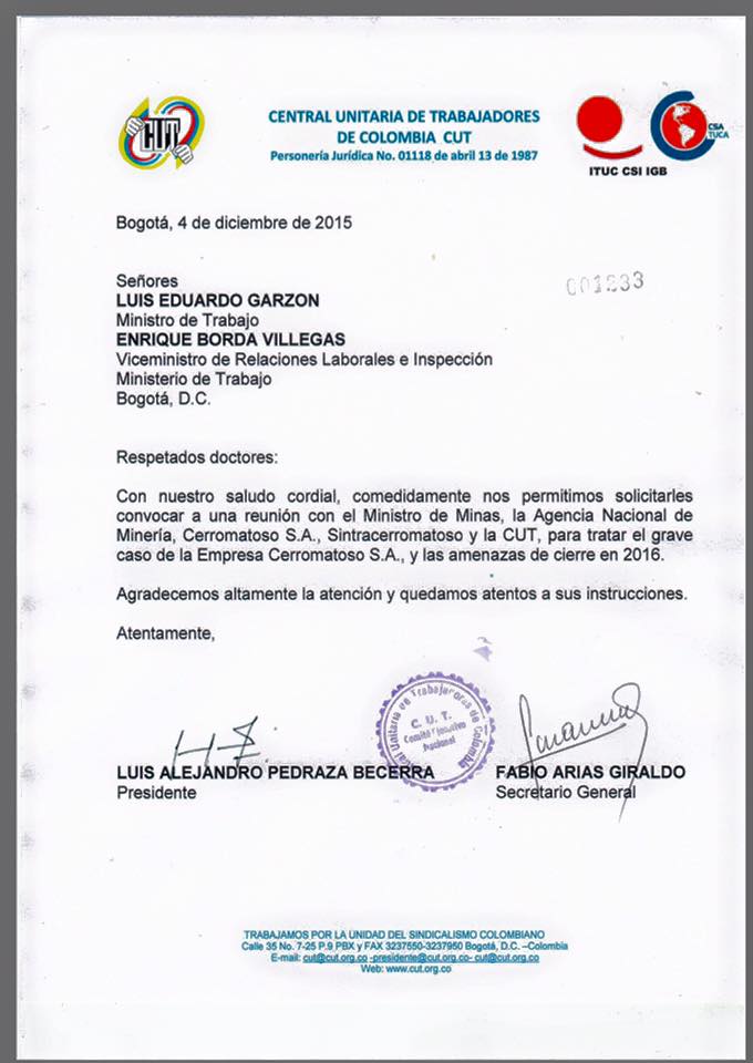 Zoom Informativo dialogo el día de ayer con el señor Domingo Hernández, presidente del Sindicato de Trabajadores de Cerro Matoso, Sintracerromatoso sobre la solicitud que hizo la organización sindical al Ministro de trabajo, Luis Eduardo Garzón y Enrique Borda Villamizar, Vice Ministro de Relaciones Laborales e Inspección de Ministerio de Trabajo, de convocar una reunión con el Ministro de Minas, la Agencia Nacional de Minería, Cerro Matoso, Sintracerromatoso y la Central Unitaria de Trabajadores de Colombia (CUT) para tratar el tema de un posible cierre de Cerro Matoso, anuncio emitido según el líder sindical, por Graham Kerr, líder de South32. Esto dijo el presidente de la organización sindical Sintracerromatoso a la directora de Zoom Informativo.