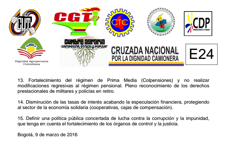 Luego del fracaso en las negociaciones del Salario Mínimo Legal, la absurda y arbitraria venta de ISAGEN, el escándalo de REFICAR, el anuncio de la Reforma Tributaria lesiva para los sectores populares, la liquidación de CAPRECOM y de SALUDCOOP, el incumplimiento para con los pensionados y los trabajadores sobre un acuerdo suscrito con usted para reducir los aportes en salud del 12 al 4% y el restablecimiento del valor del recargo nocturnos y los dominicales y festivos, constatados los incumplimientos a los acuerdos suscritos con Dignidad Agropecuaria, Cumbre Agraria, así como con la cruzada camionera, taxistas y otros sectores; sumando a lo anterior, la nociva agenda legislativa, el alto grado de empobrecimiento de nuestros campesinos y la mayoría de la población, el alto costo de la canasta familiar y el transporte público, el desempleo, la informalidad, la impagable deuda externa, todo ello producto de un modelo económico neoliberal regresivo, hemos decidido convocar, organizar y llevar a cabo una JORNADA NACIONAL DE PROTESTA bajo la figura de un PARO NACIONAL, el cual se llevará a cabo el día 17 de marzo del presente año, en todo el territorio Colombiano.