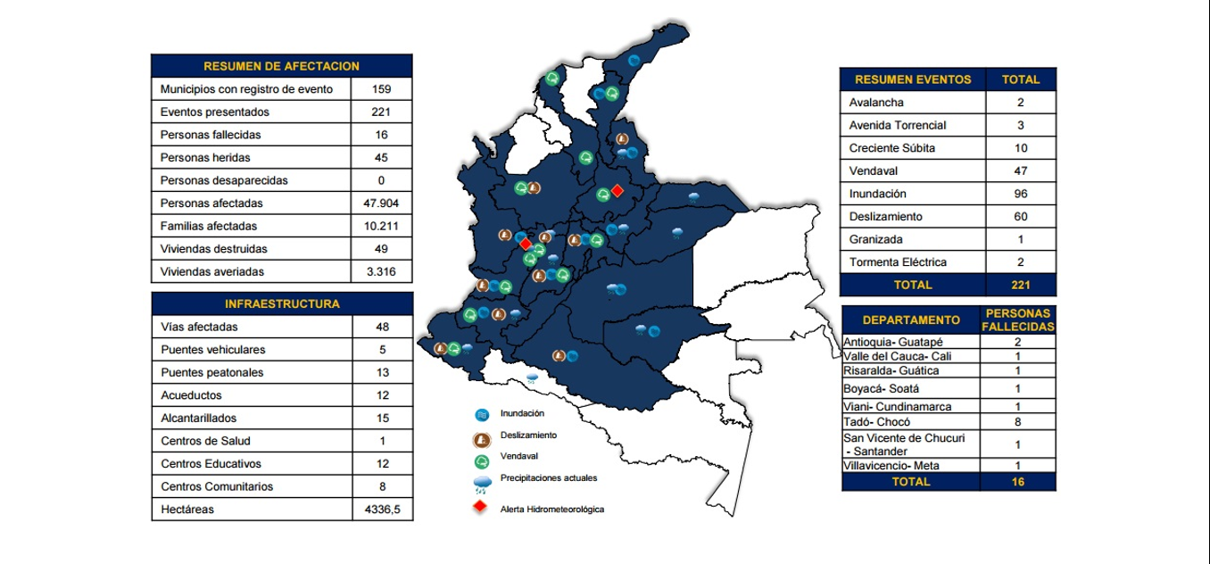 A la fecha se han presentado 221 eventos en 159 municipios del país los cuales han sido atendidos de manera primaria por los Consejos Municipales y Departamentales de Gestión del Riesgo de cada zona afectada. La Unidad Nacional para la Gestión del Riesgo de Desastres continúa el seguimiento a los eventos que se han presentado en el país. 635 millones de pesos desde el orden nacional han sido destinados para atender a 2.249 familias afectadas.