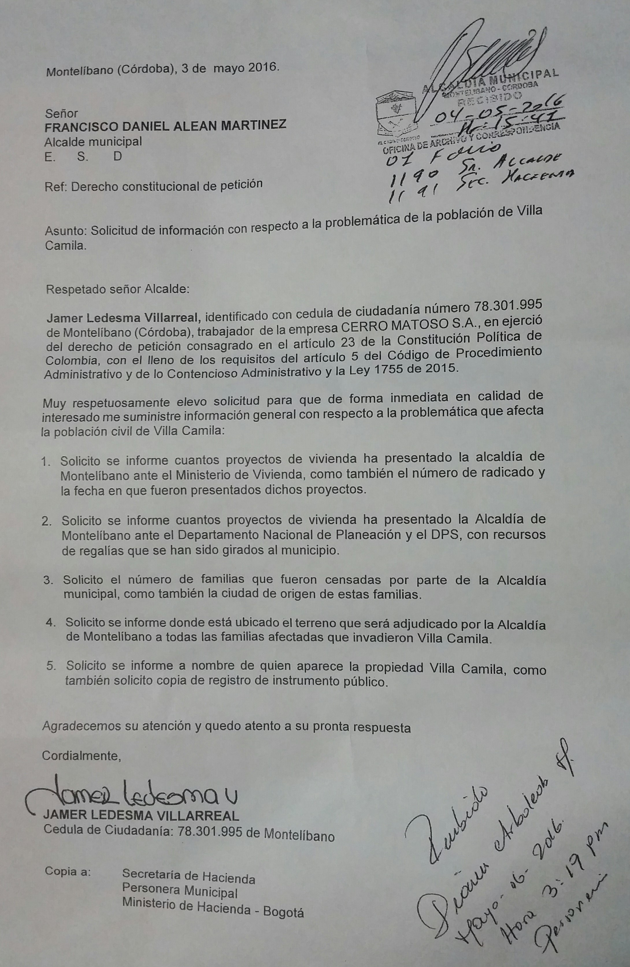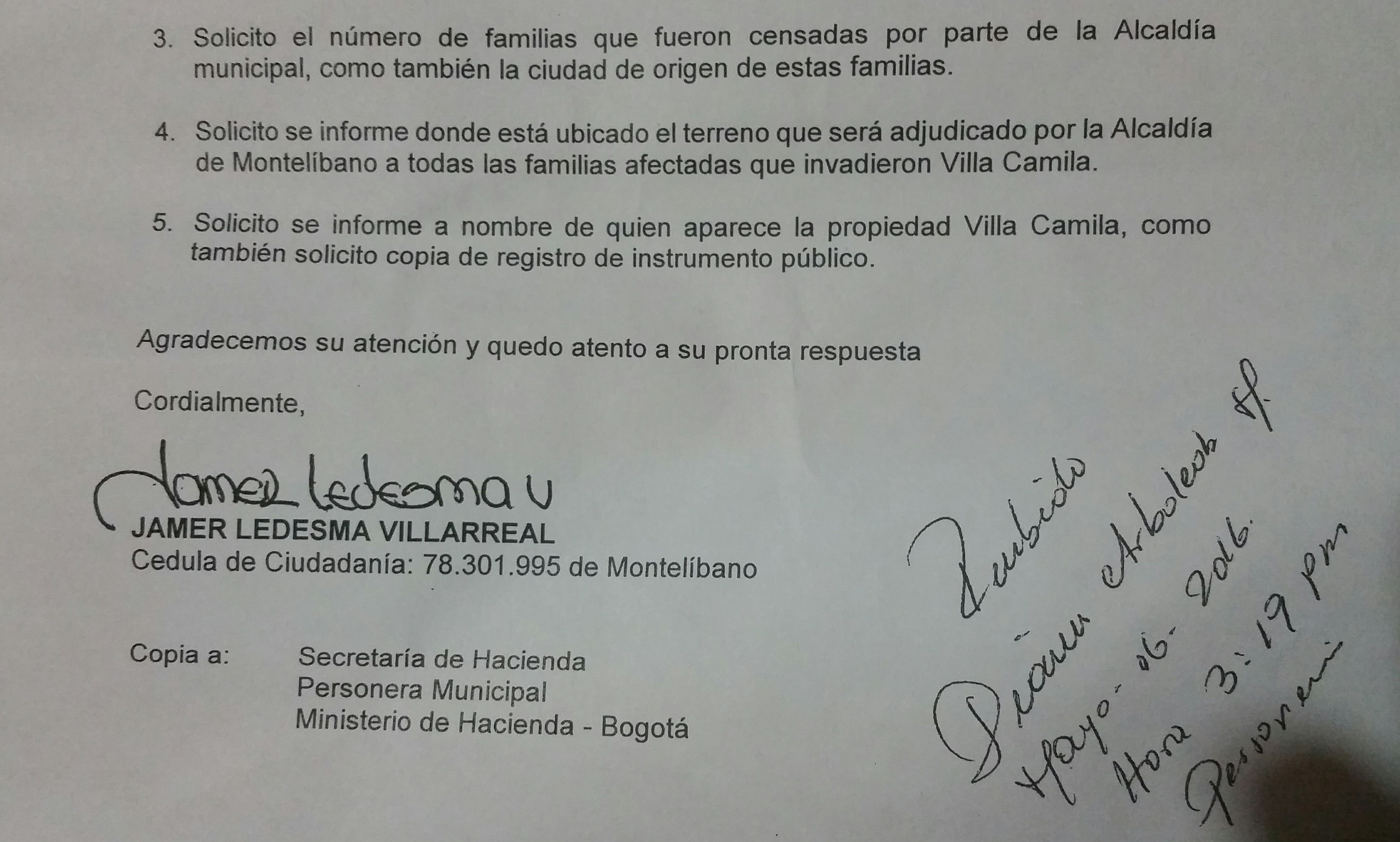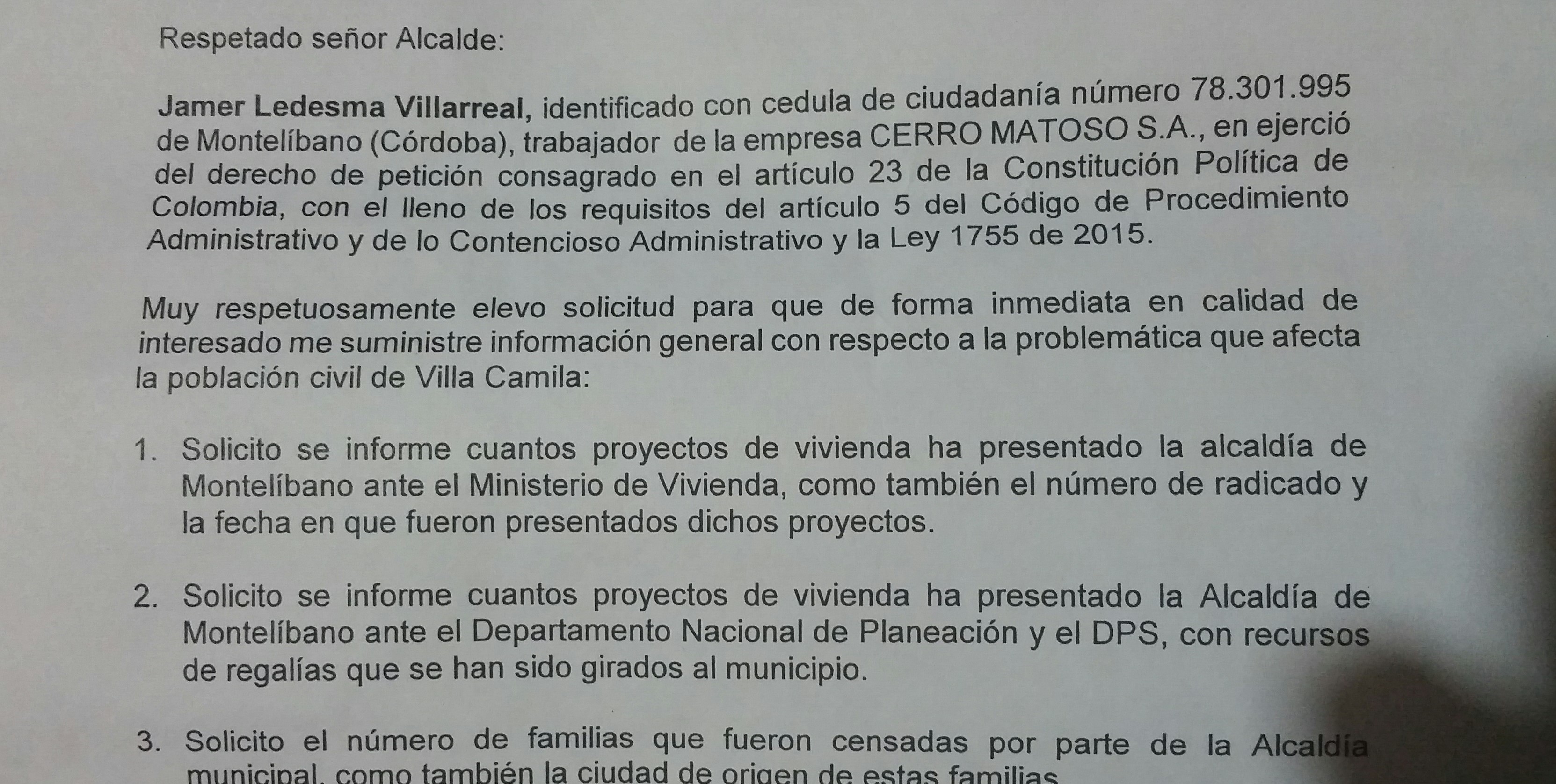 Dicha petición enviada al señor alcalde de Montelíbano, busca además un Informe sobre cuantos proyectos de vivienda ha presentado la alcaldía de Montelíbano al DNP, números de familias censadas y origen de las mismas. También ha solicitado el peticionario que un informe sobre el terreno que será adjudicado por la alcaldía a las familias afectadas que invadieron Villa Camila.