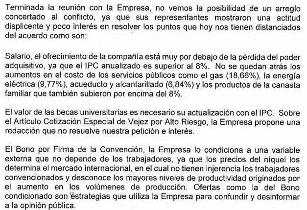 La compañía de níquel también dijo por medio de su comunicado. “Si el precio del níquel supera los $12.000 dólares la tonelada por dos meses consecutivos durante la vigencia de la convención, se pagará a cada trabajador por una única vez un bono de $5 millones. La vigencia de la convención será de tres años. Los auxilios de uniforme escolar y subsidio de servicios el incremento será el del IPC para los años 2017 y 2018.