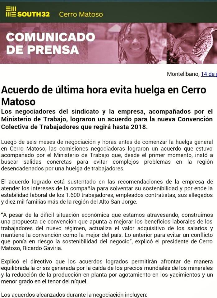 En el día de ayer en horas de la noche, cuando se acercaba el final del tiempo para la firma de la convención colectiva entre la empresa Cerro Matoso y la organización sindical Sintracerromatoso, las comisiones negociadoras con la intervención del ministerio de Trabajo, llegaron a un acuerdo logrando de esta manera evitar la huelga que estaba a punto de iniciar.