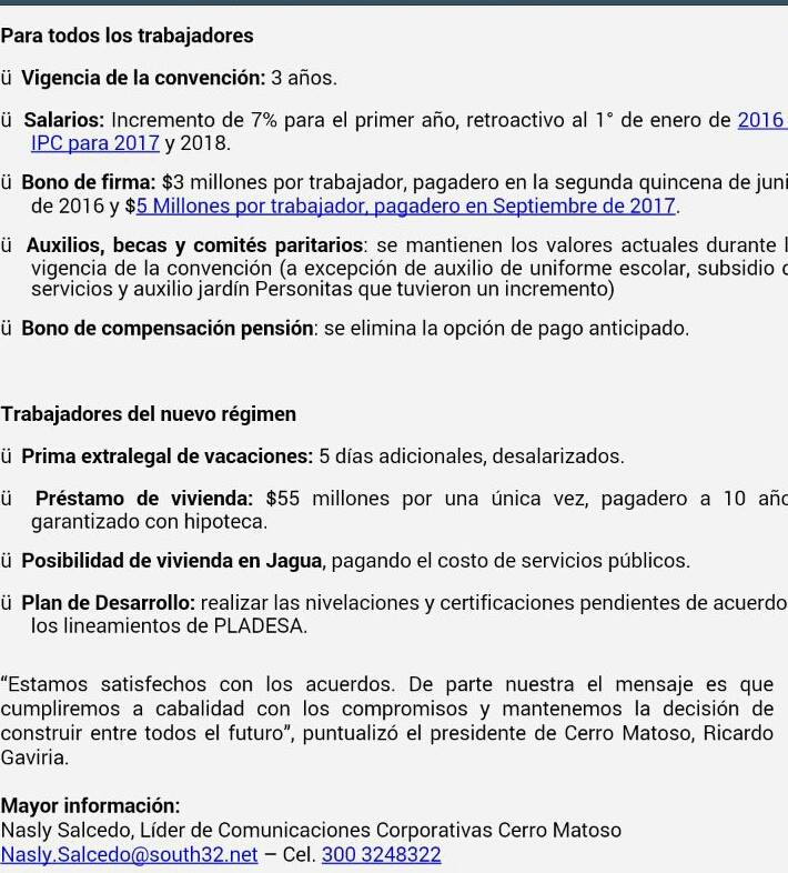 Estos son partes de los acuerdos pactados por las partes, firma de la negociación con vigencia de 3 años. Incremento de 7% para el primer año, retroactivo al 1° de enero de 2016 e IPC para 2017 y 2018. Bono de firma: $ 3 millones por trabajador, pagadero en la segunda quincena del mes de junio de 2016 y $5 millones por trabajador, pagadero en septiembre de 2017.