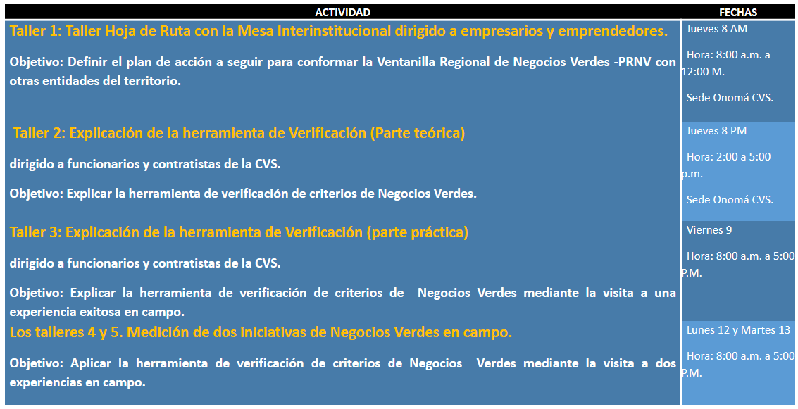 Montería. En desarrollo del convenio de asociación suscrito entre el Ministerio de Ambiente y Desarrollo Sostenible y la Corporación Fondo Biocomercio Colombia, durante los días 8, 9, 12 y 13 de septiembre se realiza en la Corporación Autónoma Regional de los Valles del Sinú y del San Jorge – CVS, cinco talleres para la “Implementación de los Programas Regionales de Negocios Verdes –PRNV.