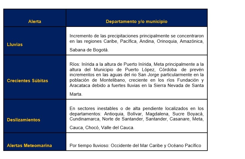 De la misma forma, el reporte de las últimas horas indica que se registró: un vendaval en Topaipí (Cundinamarca); un deslizamiento en Yolombó (Antioquia) y una inundación en San Roque (Antioquia).