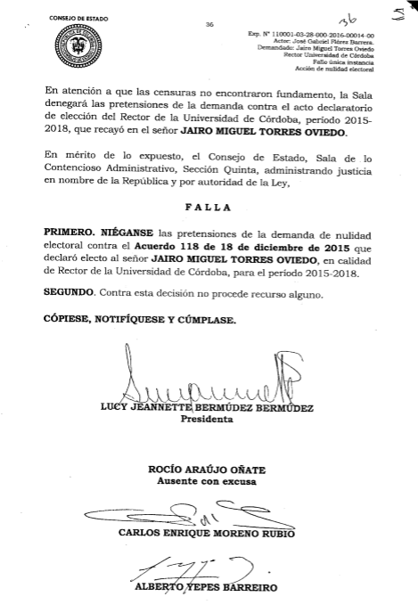 La demanda de nulidad había sido presentada por el presidente de la Asociación de Profesores Universitario, Aspu, subdirectiva Universidad de Córdoba y miembro del Consejo Superior en representación de los docentes, una vez se dio la elección de Torres Oviedo, en diciembre de 2015.