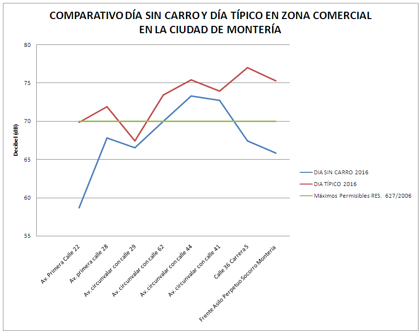 Figura 3. Comparativo de ruido ambiental en el día sin carro vs. día típico en zona comercial de la ciudad de Montería