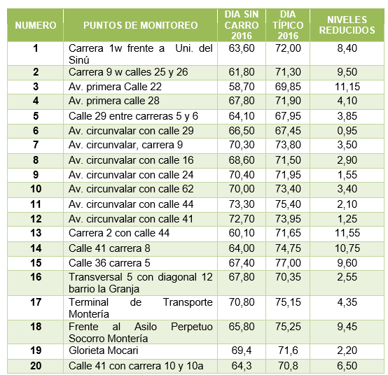 La jornada sin carro en sectores como carrera 1w frente a la Universidad del Sinú, la carrera 9 w calles 25 - 26 y la carrera 2° con calle 44 logró reducir los NPS de 8,4 dB, 9,5 dB y 11,55 dB (ver tabla comparativa).