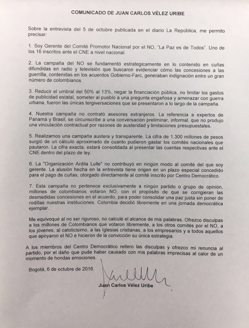 Tras la entrevista de Juan Carlos Vélez Uribe, al diario La República en la que reveló varios detalles de la campaña del ’No’, y como fue financiada y que entidades aportaron los rubros para apoyar el NO y con la avalancha de regaños y comentarios en su contra, el Gerente del NO, decidió renunciar y rectificar varias de sus afirmaciones y pedir discuplas porque según el no medio sus palabras a la hora de dar las declaraciones.