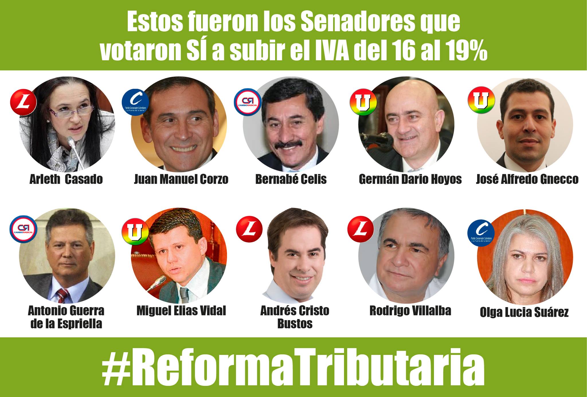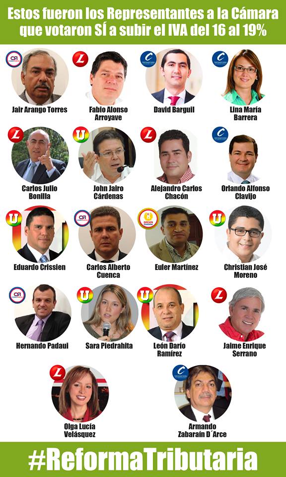 Nacional. Esta es la publicación de la Senadora Claudia López."Estos Congresistas votaron para que usted pague IVA del 19% y se negaron a ponerle impuesto a las bebidas azucaradas que causan obesidad. ¿Por qué? Porque la industria azucarera/bebidas aportó a campañas $1.955 millones. Lobby + prepagos = ciudadanos sin representantes pagan lo que los pudientes se ahorran con prepagos #ReformaTributaria"