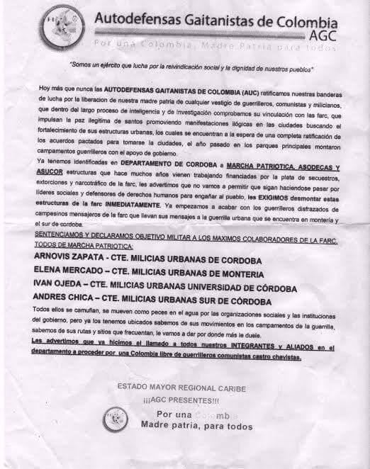 Córdoba. En el departamento de Córdoba miembros del Movimiento Social, Marcha Patriótica, Asodecas y Asucor han sido declarados objetivo militar al parecer por grupos armados que operan en la región. Los líderes Elena Mercado, Arnovis Zapata, Iván Ojeda y Andrés Chica, miembros de Marcha Patriótica y activistas sociales fueron amenazados de muerte a través de un panfleto, el cual fue introducido por debajo de la puerta, en la sede que que el movimiento tiene en el barrio la Floresta de la ciudad de Montería.