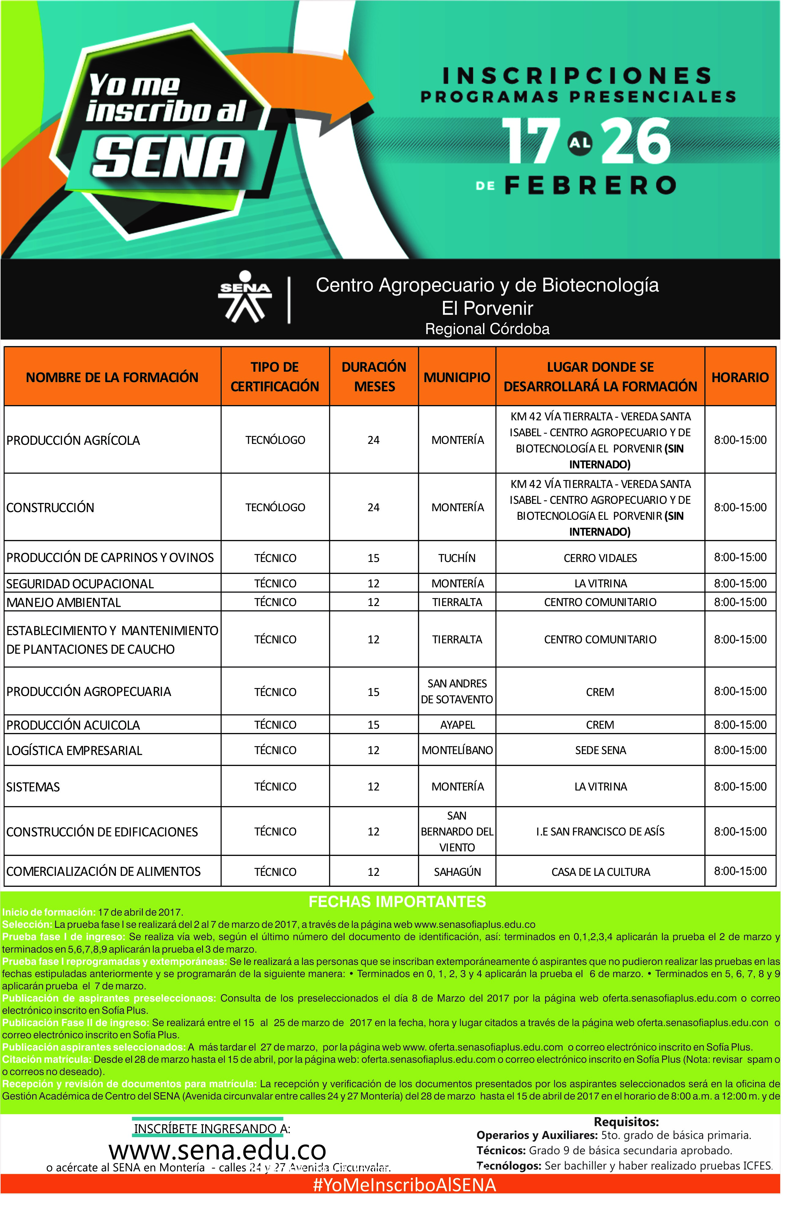 Montelíbano. Con la apertura de la nueva sede del SENA en el San Jorge, ubicada en el municipio de Montelíbano, esta es la primera oferta educativa del 2017 programada durante los días 17 al 26 de febrero del año en curso y los interesados pueden realizar sus inscripciones a través de la página de la entidad www.senasofiaplus.edu.co.