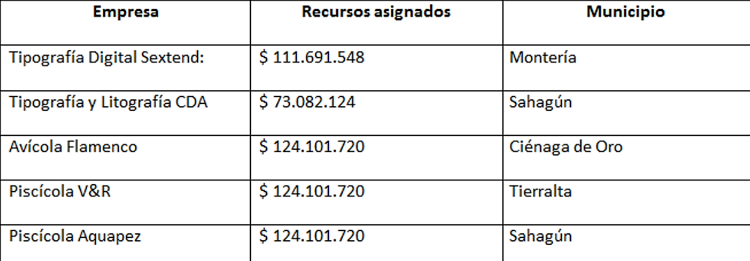 Los municipios beneficiados en Córdoba con proyectos del Fondo Emprender son: Tierralta, Valencia, Montería, Cereté, San Carlos, Sahagún, Ciénaga de Oro, San Andrés de Sotavento, Momil, San Bernardo del Viento, Chimá, Planeta Rica, Lorica y Cotorra.
