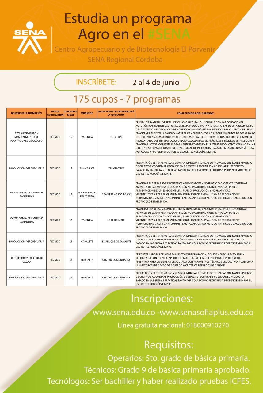 El Subdirector del Centro Agropecuario y de Biotecnología El Porvenir (CABP) José Nicolás Barrios Sierra, resaltó que en Córdoba se ofertarán siete programas de formación: Establecimiento y Mantenimiento De Plantaciones De Caucho; Producción Agropecuaria, mayordomía De Empresas Ganaderas; Mayordomía De Empresas Ganaderas; Producción Agropecuaria; Producción y Cosecha de Cacao; Producción Agropecuaria.
