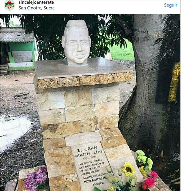 Esta es la escultura que al parecer colocó la alcaldesa de San Onofre, María Balseiro López, en honor al joven cantante de música Vallenata Martín Elías, quien perdió la vida en un accidente de tránsito y que ha sido una gran pérdida para el folclor colombiano.