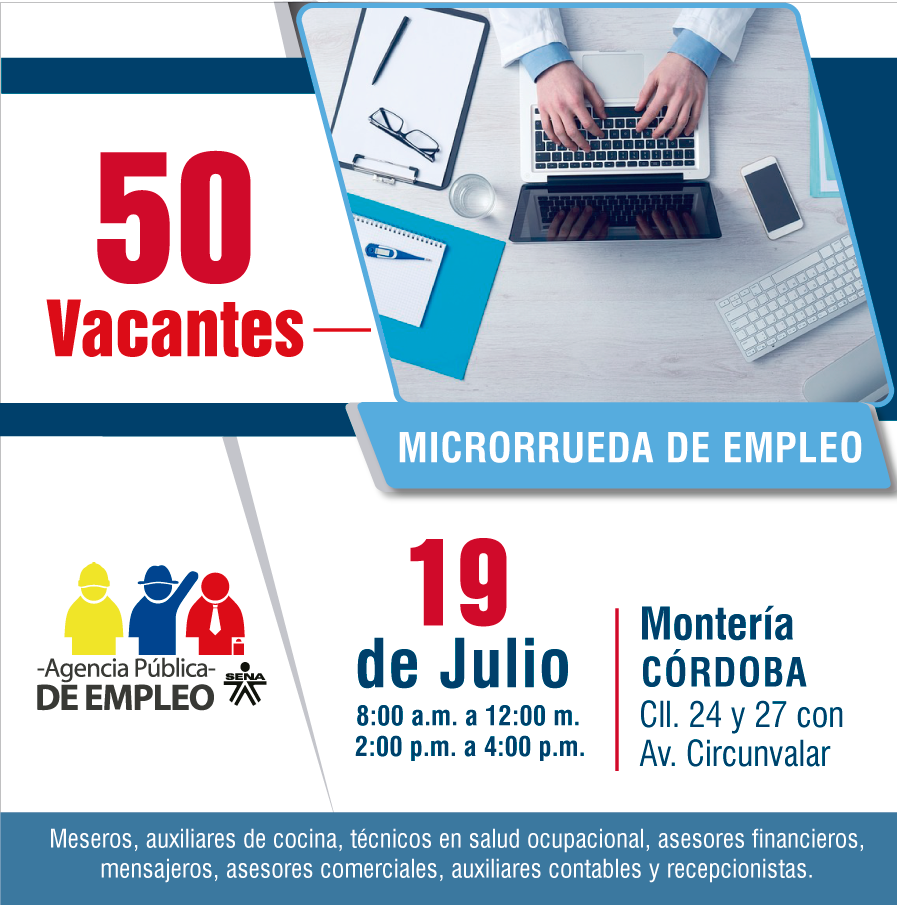 Montería. Este miércoles 19 de julio de 8:00 a.m. a 12:00 m y de 2:00 p.m. a 4:00 p.m. se realizará una Microrrueda de Empleo en las instalaciones del SENA regional Córdoba, ubicada en la Avenida Circunvalar entre calles 24 y 27 de esta ciudad.