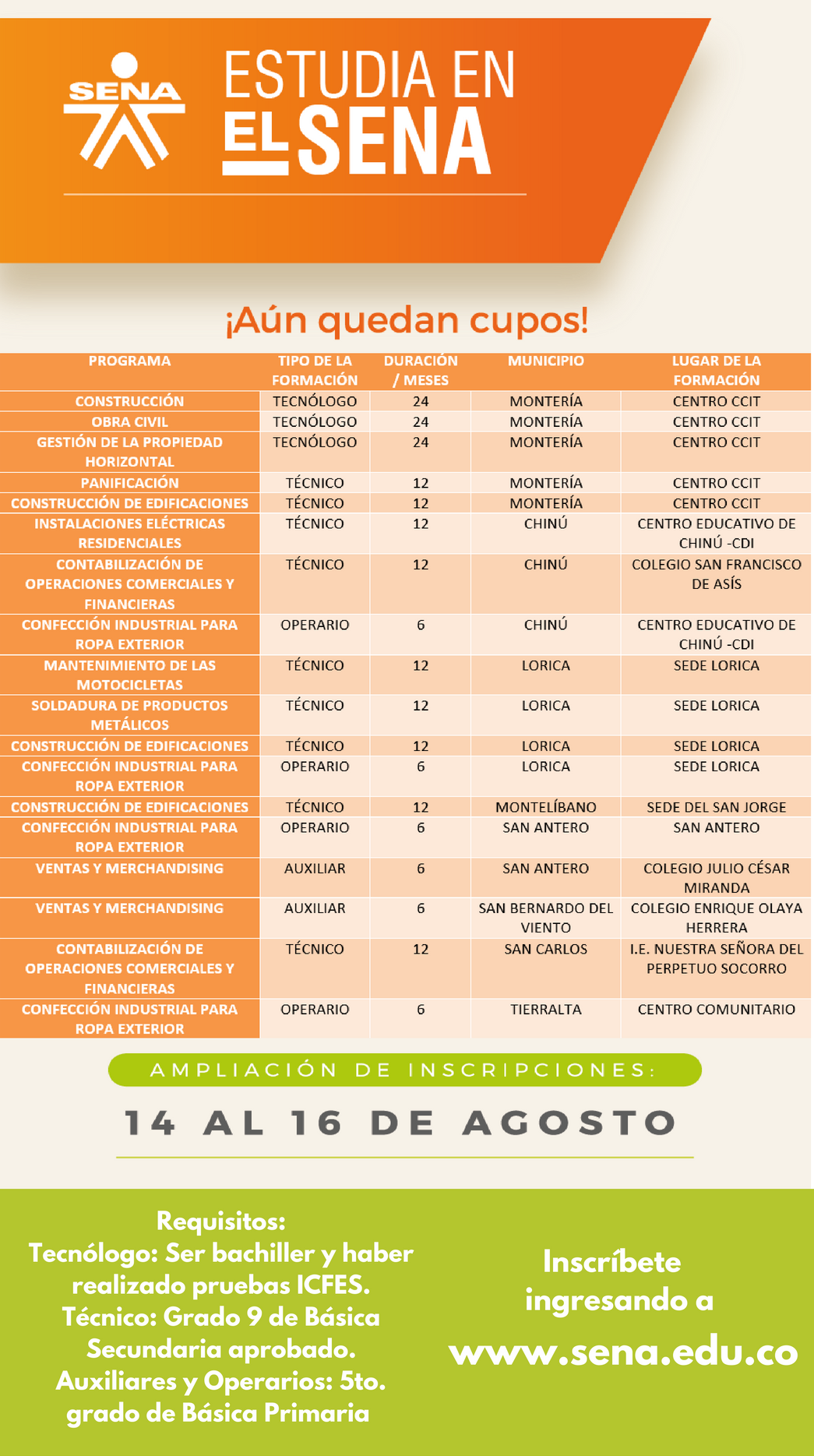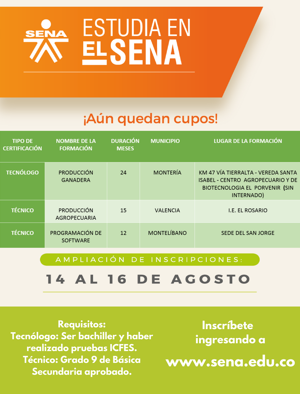 Córdoba. Las inscripciones de la cuarta y última convocatoria de formación titulada en la modalidad presencial de 2017 del SENA, se ampliaron hasta HOY miércoles 16 de agosto. Con el fin de beneficiar a más cordobeses con los programas de formación del Centro de Comercio, Industria y Turismo (CCIT) y el Centro Agropecuario y de Biotecnología El Porvenir (CABP) de la Regional Córdoba, compartimos los programas en los que aún hay cupos para que los interesados se puedan inscribir y estudiar en el SENA.