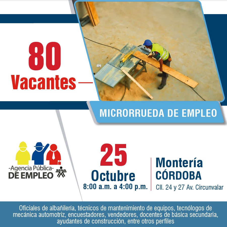 Montería. Este miércoles 25 de octubre de 8:00 a.m. a 12:00 m y de 2:00 p.m. a 4:00 p.m. se realizará una Microrrueda de Empleo en las instalaciones del SENA Regional Córdoba, ubicada en la Avenida Circunvalar entre calles 24 y 27 de esta ciudad.