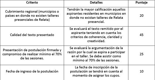 Algunos de los criterios de selección son: encontrarse en un municipio o país donde no existen los talleres presenciales de Relata, la calidad del texto presentado y la argumentación realizada para participar en el taller.
