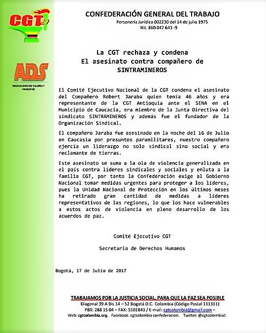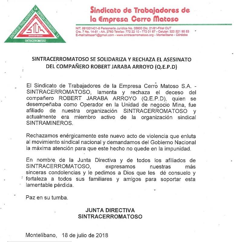 Por estas muertes tan triste de líderes la voz que se levanta es que, “SINTRAMINEROS rechaza categóricamente el asesinato de nuestro amigo y ex-líder sindical ROBER EMIRO JARABA quien fue un defensor en potencia de Los DERECHOS HUMANOS, ya basta!! ..no más asesinatos hacia nuestros líderes!! en nombre de la CGT COLOMBIA Y SINTRAMINEROS denunciamos públicamente estas muertes de luchadores, con nuestro amigo ROBERT van 124 asesinatos en Colombia y no habido ni una sola captura ,es triste pero es nuestra realidad, un país lleno de corrupción e injusticia donde aquel que reclama sus derechos es callado de forma atroz ....Ya no más muertes por favor, nosotros solo queremos paz!! queremos que todos los que somos líderes seamos importantes para la sociedad, reclamamos JUSTICIA!!!