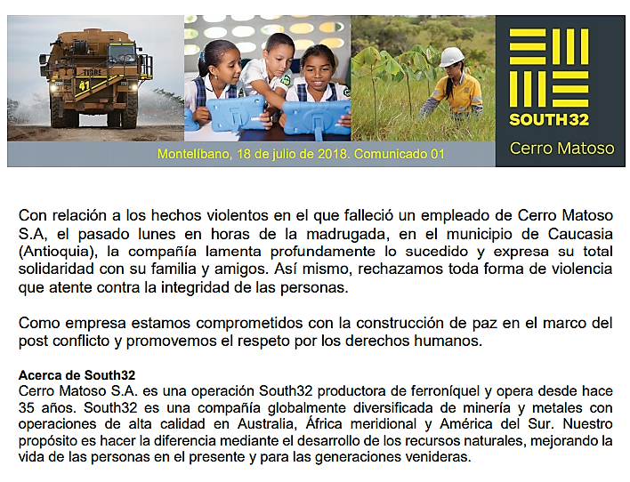Los líderes de la organización Sindical Sintramineros están consternados, Noticias Zoom, ha estado cerca a este hecho y hablamos fuera de cámara con algunos de ellos, que con sus ojos llenos de lágrimas dicen que, “esto es duro”, no han dado declaraciones porque recomendaciones de la Confederación General de Trabajo (CGT), quien a su vez está gestionando para que la Unidad Nacional de Protección brinde garantías a los líderes de la organización e igualmente rechazan el asesinato y exigen al gobierno que tomes medidas urgentes.