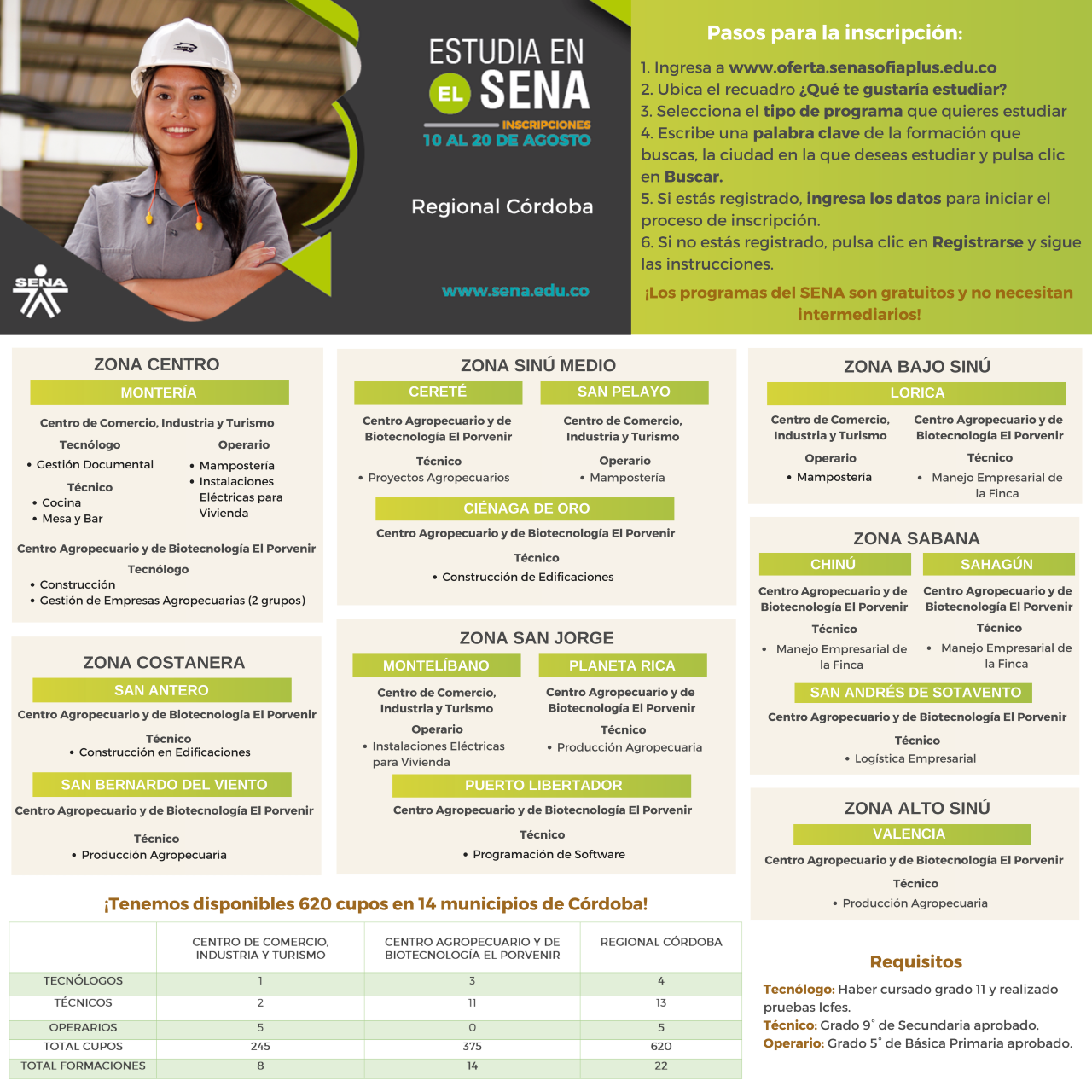 Para el caso de Córdoba hay disponibles 620 cupos de los cuales 375 son para el Centro Agropecuario y de Biotecnología El Porvenir y 245 para el Centro de Comercio, Industria y Turismo.