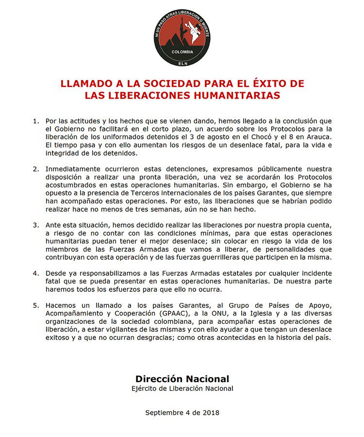 Nacional. Este es el comunicado emitido por el Ejercito de Liberación Nacional (ELN) donde afirman que han llegado a "la conclusión que el Gobierno no facilitará en el corto plazo, un acuerdo sobre los Protocolos para la liberación de los uniformados detenidos el 3 de agosto en el Chocó y el 8 en Arauca. El tiempo pasa y con ello aumentan los riesgos de un desenlace fatal, para la vida e integridad de los detenidos".