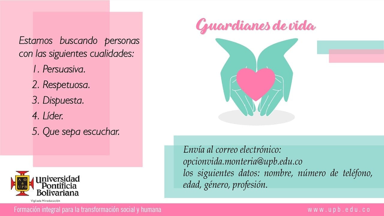 Montería. Hoy, 10 de septiembre, cuando se conmemora el Día Mundial para la Prevención del Suicidio, la Universidad Pontificia Bolivariana, a través de la Escuela de Ciencias Sociales y Humanas, abre la convocatoria en la ciudad de Montería a voluntarios que deseen formarse como “Guardianes de vida” para escuchar y apoyar a personas en momentos de dificultad.