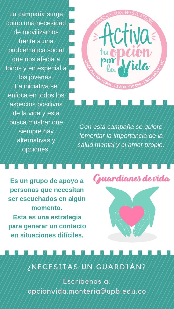 Esta convocatoria hace parte de la estrategia de sensibilización y apoyo comunitario “Activa tu opción por la vida” que lidera la UPB Seccional Montería y que busca mostrar que siempre hay alternativas y opciones para la solución de problemas.
