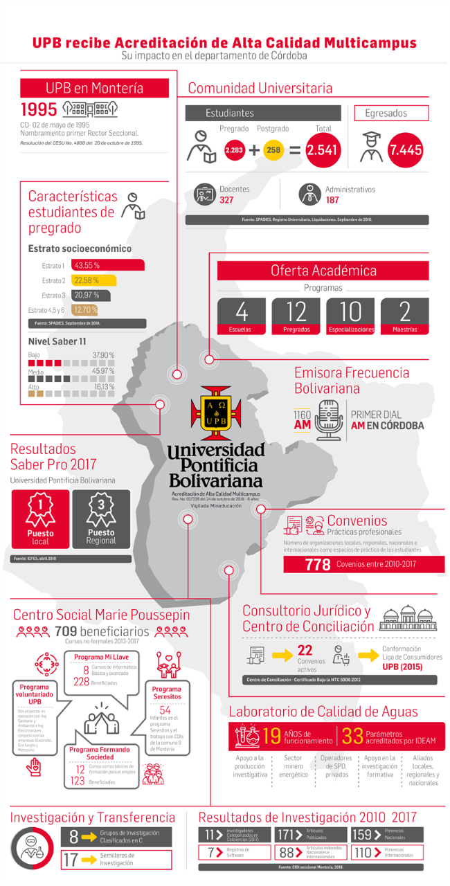 Con esta Acreditación la UPB sigue impactando en cada una de las regiones en las que tiene presencia. En Montería, la Universidad cuenta con 2.283 estudiantes en pregrado, 258 en postgrado, 327 docentes (internos y externos) y 187 administrativos. Hasta septiembre del presente se han formado en sus aulas 7.445 bolivarianos.