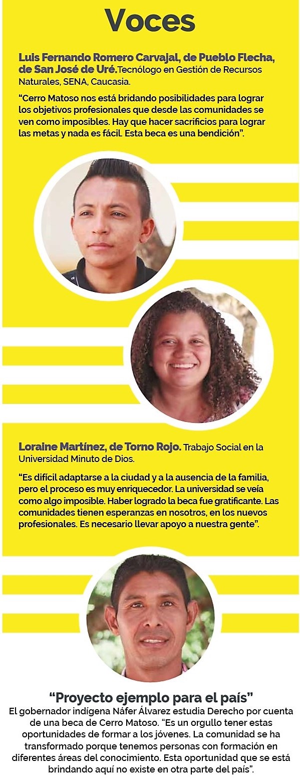 Diani Luz Vitar Díaz, se graduó en Montería en Cocina Internacional y Organización de Eventos, comenzó Ingeniería Ambiental y sintió la derrota, pero con empeño se reorientó y ahora vive su gran sueño. Alber Suárez, Tecnólogo en Construcción Civil, debió cambiar de una universidad al SENA y padeció el impacto brutal de irse del campo a la gran ciudad. Davison Suárez, Tecnólogo en Sistemas Electromecánicos, al comienzo no siguió el Plan de Estudios y tomó materias en desorden y tardó cuatro semestres en salir de esa pesadilla. Geidi Tatiana Sáenz, Licenciatura en Pedagogía Infantil, viajó todos los días de su carrera desde Puerto Colombia a Montelíbano; su secreto: la máxima dedicación. Loraine Martínez, Trabajo Social, ahora que conoció la vida académica quiere seguir en las aulas estudiando idiomas y aspirando a irse al exterior. Luis Alfredo Mora, Ingeniero de Sistemas que hace las prácticas en Cerro Matoso pero ya tiene ofertas laborales en Montería. Luis Fernando Romero Carvajal, Tecnólogo en Gestión de Recursos Naturales, considera que su vida cambió totalmente y que es necesario que las relaciones entre la compañía y las comunidades sean bajo un ambiente de armonía constante.