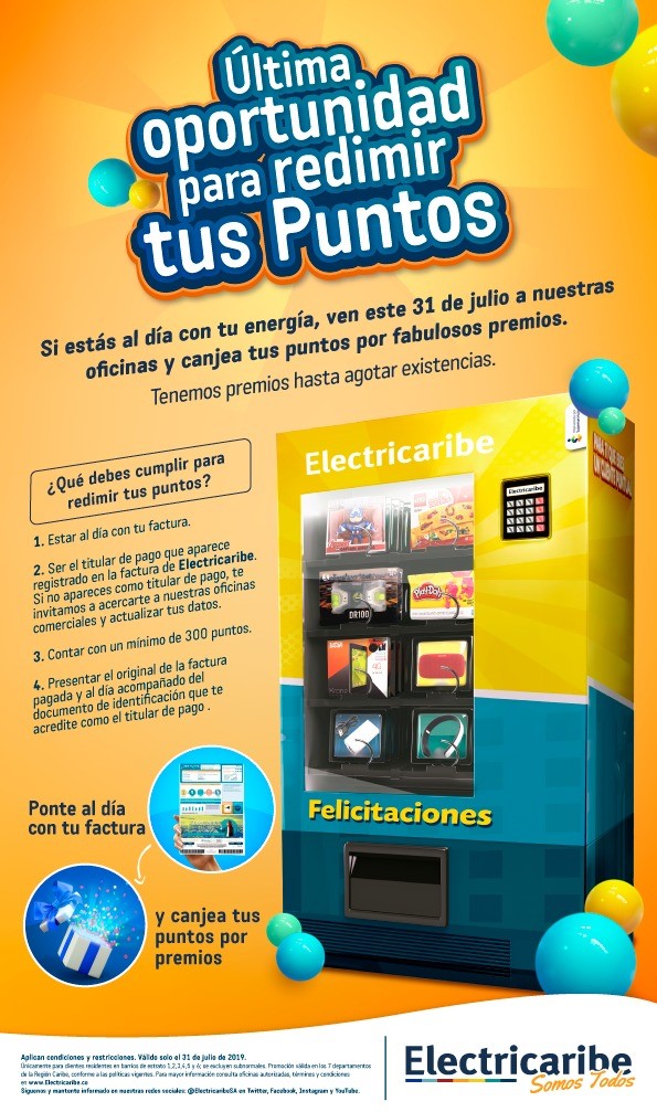 Caribe. Este 31 de julio en una gran jornada comercial de la empresa Electricaribe en los 7 departamentos de la región Caribe, los clientes podrán canjear sus puntos acumulados por pago oportuno de sus facturas, por premios en las oficinas comerciales de la compañía hasta agotar existencias.