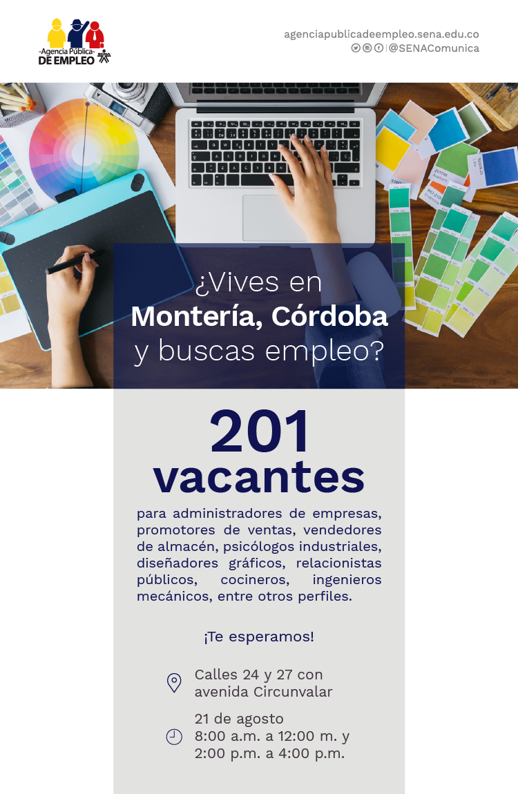 Montería. Este miércoles 21 de agosto de 8:00 a.m. a 12:00 m. y de 2:00 p.m. a 4:00 p.m. se realiza una Microrrueda de Empleo en las instalaciones del SENA Regional Córdoba, ubicada en la Avenida Circunvalar entre calles 24 y 27 de esta ciudad.