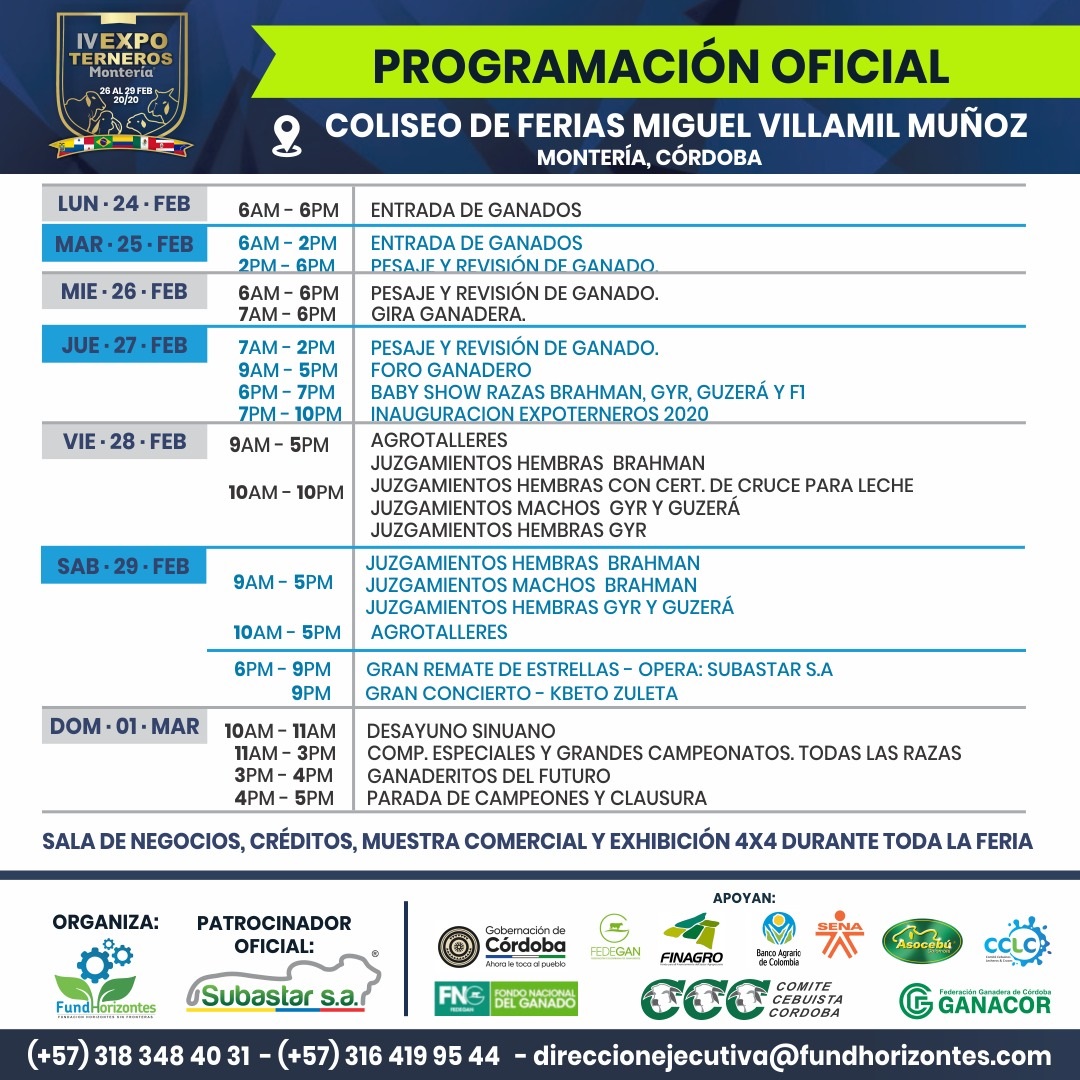 Montería. En febrero de 2020 se desarrollará la cuarta versión de la gran vitrina ganadera comercial del Caribe colombiano EXPOTERNEROS, la cual es organizada por la Fundación Horizontes Sin Fronteras, cuenta con el patrocinio de SUBASTAR S.A y el apoyo de Fedegan, Fondo Nacional del Ganado, los distintos comités ganaderos regionales y con el aval de la Asociación Colombiana de Ganado Cebú ASOCEBU.