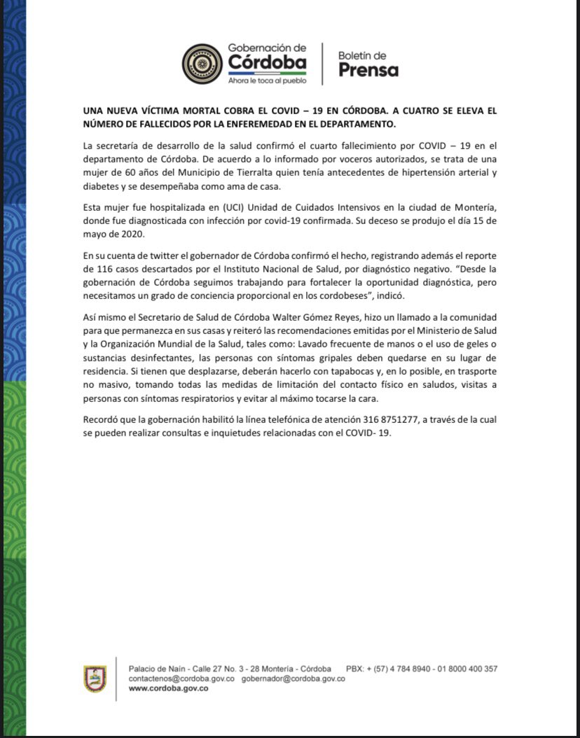 En su cuenta de Twitter, el gobernador de Córdoba confirmó la noticia. "Fallece 4to paciente con Covid19 confirmado en Córdoba: Se trata de paciente femenina procedente de Tierralta, de 60 años quien fue asistida por mutual ser, presentó infección por Covid19 confirmada, insuficiencia cardiaca e insuficiencia renal con requerimiento de diálisis".