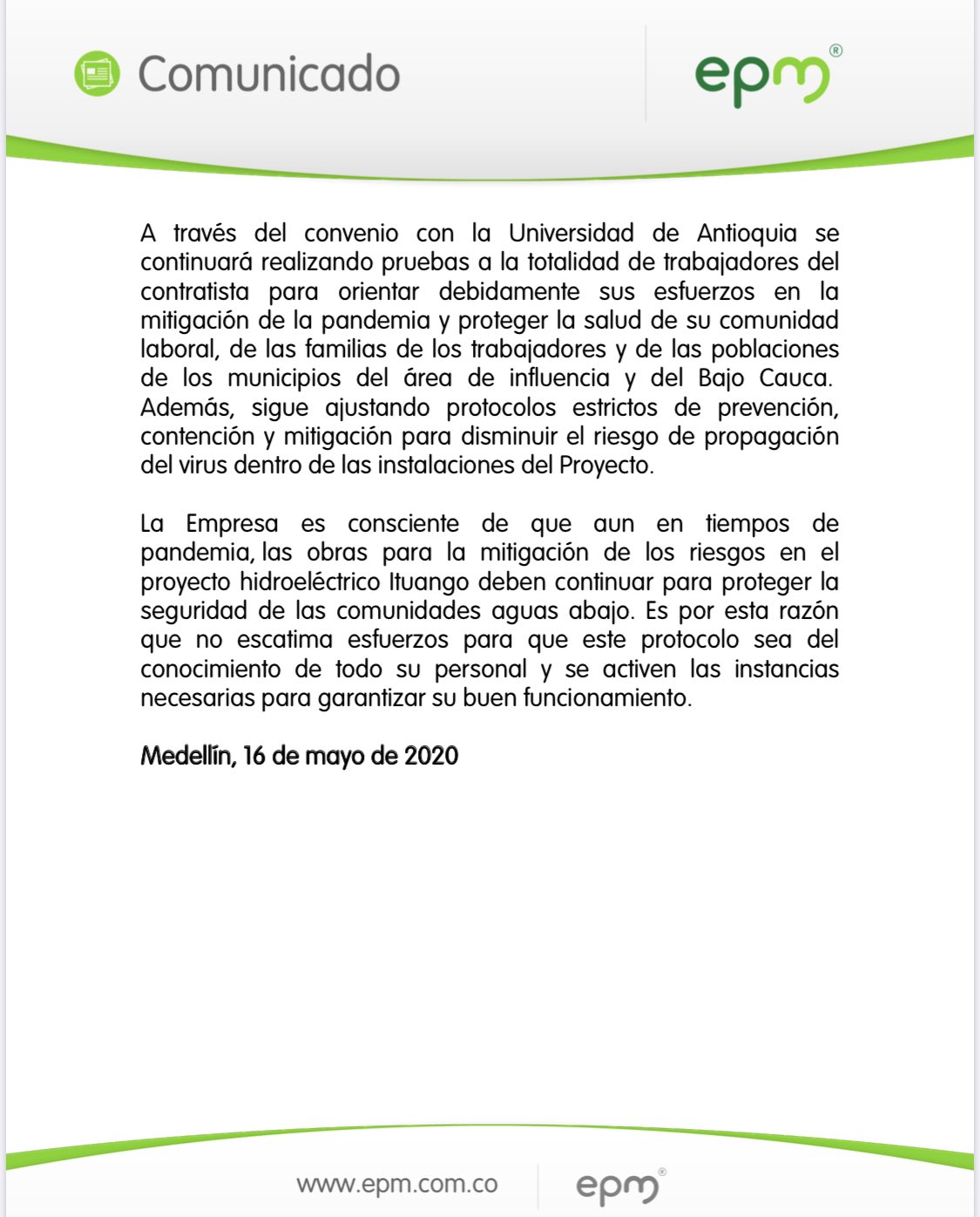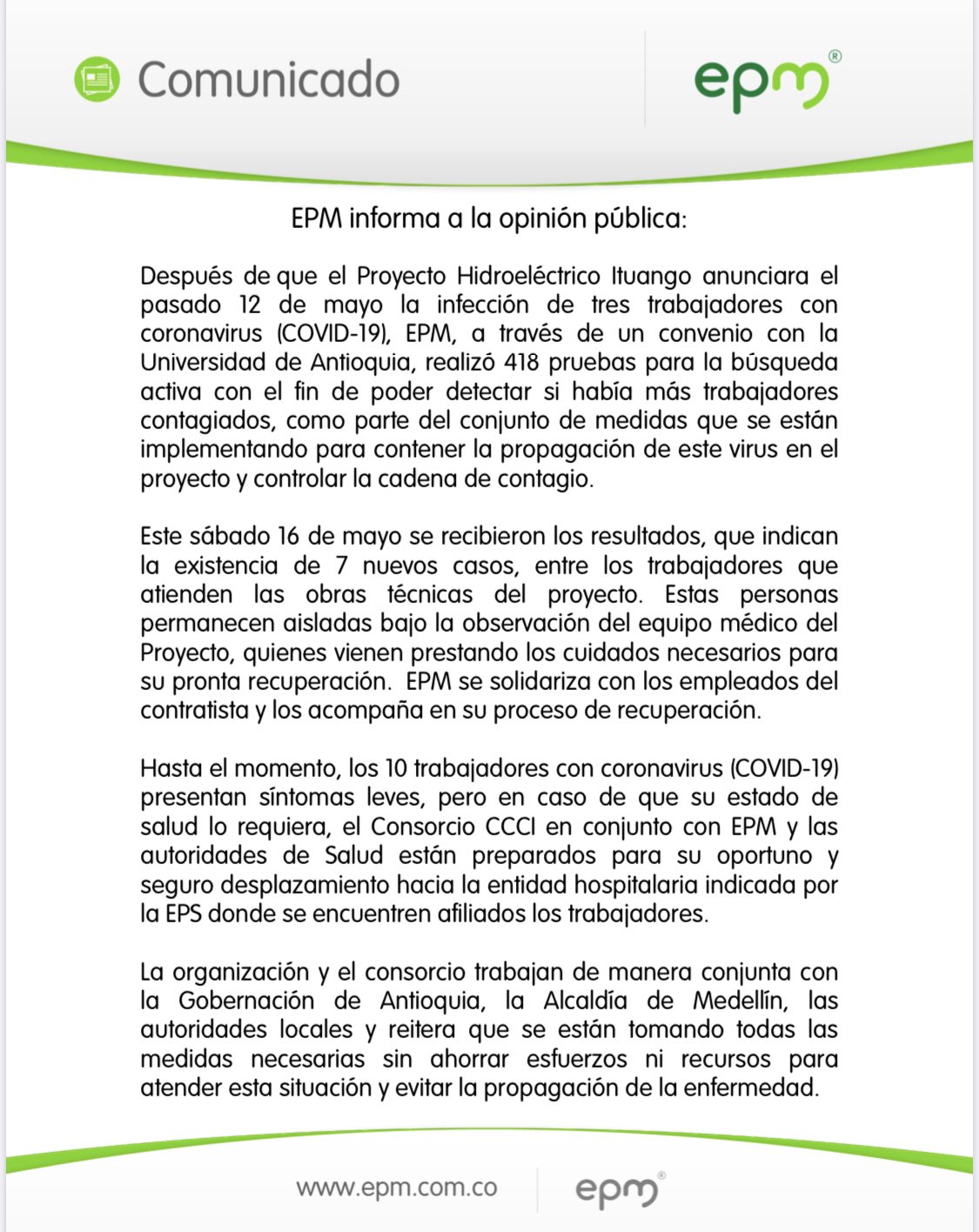 Antioquia. En el proyecto hidroeléctrico Hidroituango, ya son 10 las personas oficialmente registradas con coronavirus, los primeros 3 contagios se registraron el pasado 12 de mayo y el sábado 16 de mayo, se conoció el registro de los 7 nuevos casos.