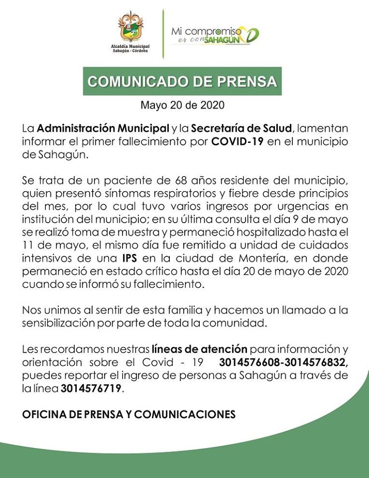 Sahagún. La mañana de este miércoles 20 de mayo, se conoció del deceso del señor Sigilfredo Laureano Jatiz Castro, un paciente que padecía de coronavirus en el municipio de Sahagún. El gobernador de Córdoba confirmó la noticia. "Lamento profundamente el fallecimiento del 5to paciente con Covid19 en Córdoba, mi solidaridad con su flia".