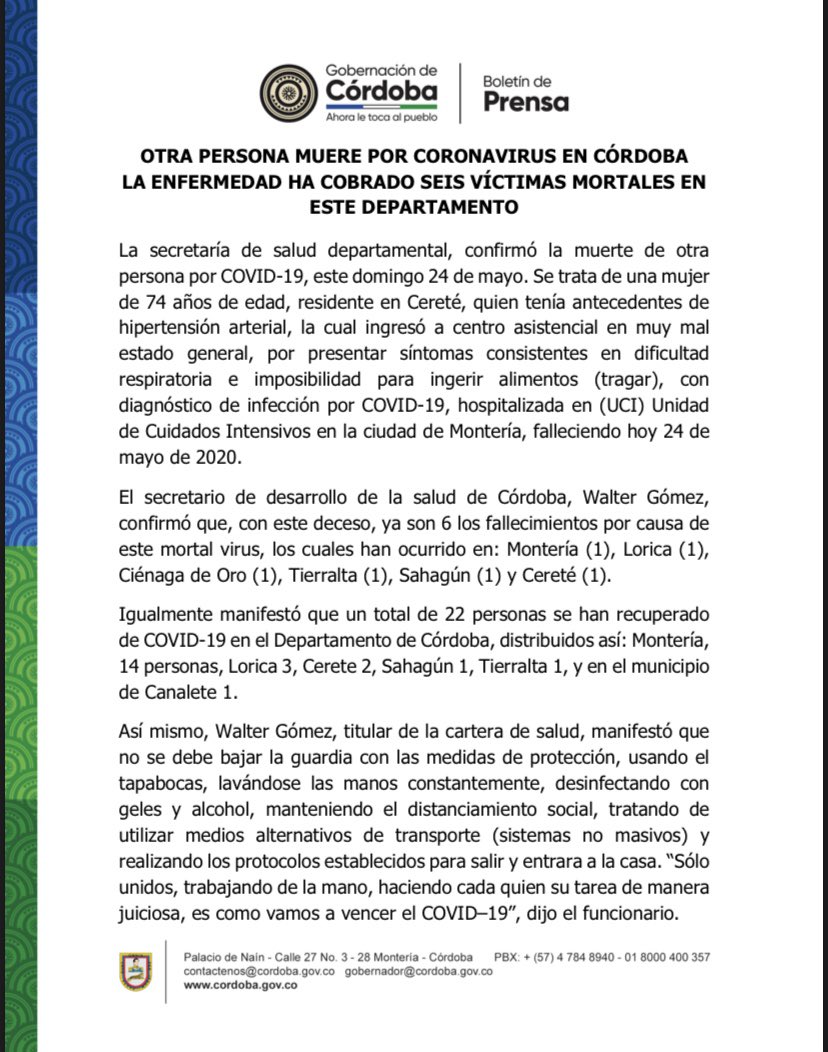 Córdoba. La mañana de este domingo 24 de mayo, el gobernador de Córdoba, Orlando Benítez, confirmó la muerte del 6° paciente con coronavirus. "Me permito informar el fallecimiento del 6to paciente con Covid19 en Córdoba, mi solidaridad con su familia y amigos".