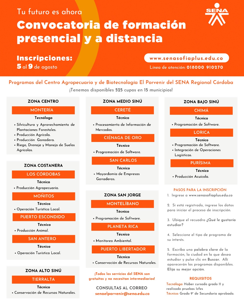En el caso del departamento de Córdoba, a través del Centro Agropecuario y de Biotecnología El Porvenir, se cuenta con 525 cupos disponibles en programas tecnólogos y técnicos. Entre los tecnólogos se encuentran Silvicultura y Aprovechamiento de Plantaciones Forestales; Producción Agrícola; Producción Ganadera; y Riego Drenaje y Manejo de Suelos Agrícolas. Mientras que algunos de los programas técnicos que se ofertan son: Producción Agropecuaria; Operación Turística Local; Producción Animal; Programación de Software; Mayordomía de Empresas Ganaderas; Procesamiento de Información de Mercados; Producción Acuícola; Integración de Operaciones Logísticas y Conservación de Recursos Naturales.