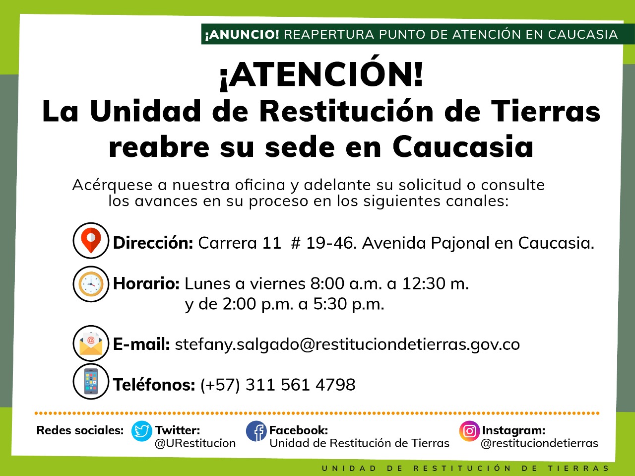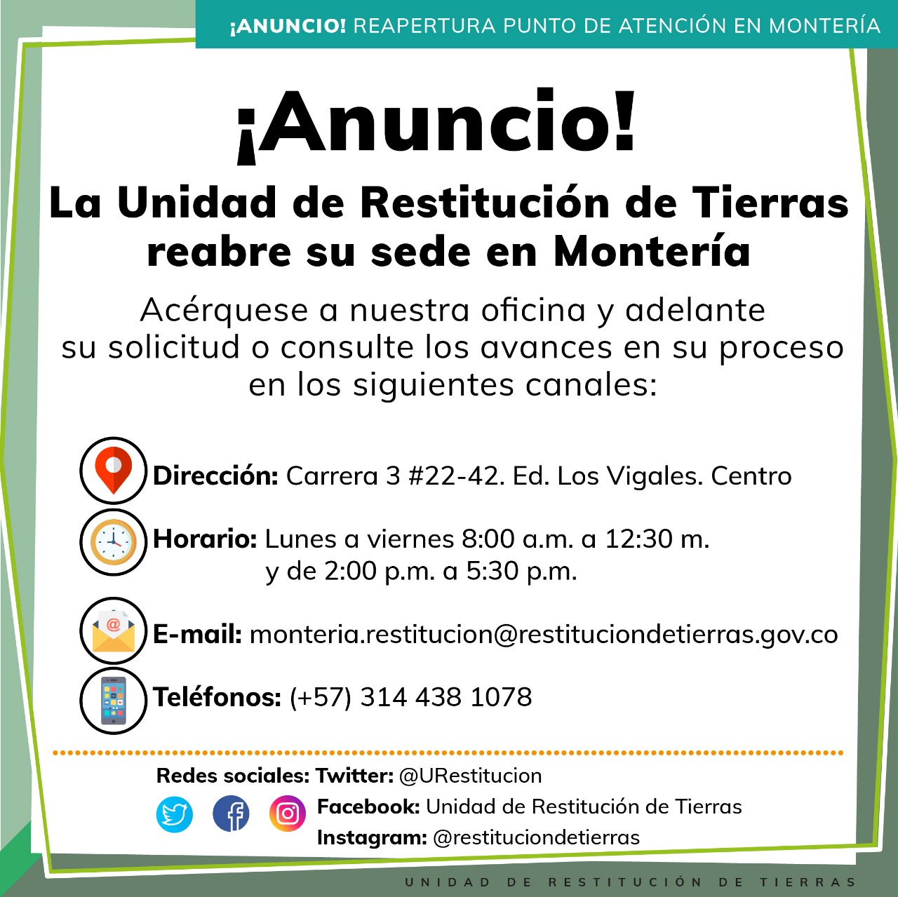 La directora de la Unidad de Restitución en la zona, Dina Montalvo, expresó que para las personas que no puedan movilizarse hasta las oficinas, tendrán a su disposición canales de atención como la línea celular 314 4381078 y los correos: monteria.restitucion@restituciondetierras.gov.co denis.gonzalez@restituciondetierras.gov.co cindy.herazo@restituciondetierras.gov.co atencionalciudadano@restituciondetierras.gov.co