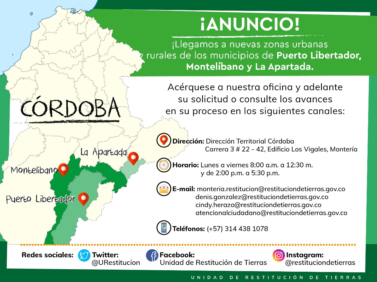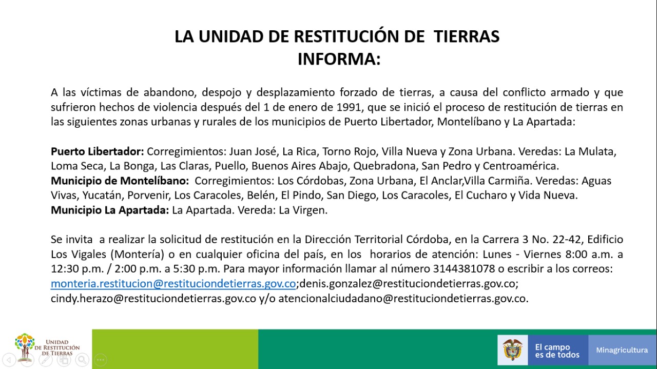 “La Unidad de Restitución de Tierras continúa comprometida con el restablecimiento de los derechos sobre las tierras en la subregión del sur de Córdoba, es por eso que hacemos un llamado a todas las personas víctimas de abandono, despojo y desplazamiento forzado de tierras, a causa del conflicto armado y que sufrieron hechos de violencia después del primero de enero de 1991 en los municipios de La Apartada, Puerto Libertador y Montelíbano”, manifestó Dina Luz Montalvo, directora territorial de la Unidad de Restitución de Tierras en Córdoba y el Bajo Cauca antioqueño.