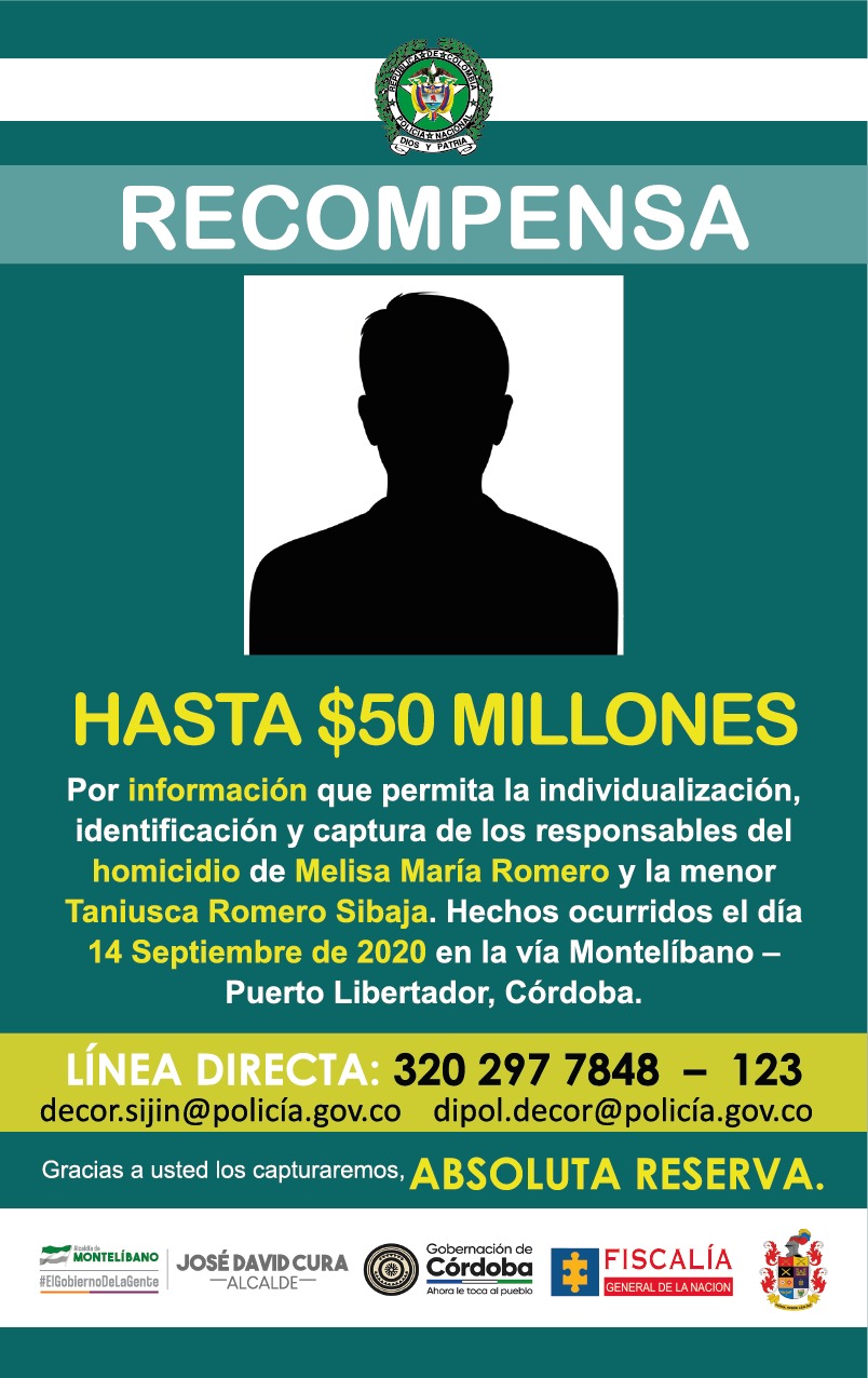 Es así, como se estableció una recomprnsa de hasta 50 millones dr pesos, a quienes puedan suministrar información que permita identificar a los autores y esclarecer los móviles de los homicidios del líder comunal Cristóbal José Ramos y Luis Emilio Díaz Mendoza, hechos ocurridos el pasado 10 de septiembre en el barrio Villa Clemen, así mismo el homicidio de Melisa María Romero y la menor de tan solo 12 años de edad Taniusca Romero Sibaja, víctimas de ateque con arma de fuego en la vía Montelíbano - Puerto Libertador el pasado 14 de septiembre.