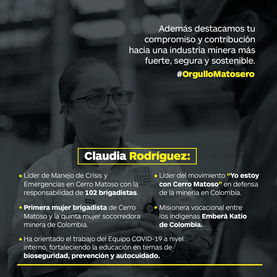 Claudia Rodríguez, quien trabaja en Cerro Matoso hace 18 años, es coordinadora de la Brigada de Emergencias de la empresa y líder del movimiento “Yo estoy con Cerro Matoso” en defensa de la minería a nivel nacional. En su tiempo libre, es misionera vocacional entre los indígenas Emberá Katío de Colombia, donde trabaja con la producción de materiales en la lengua nativa de esta etnia para ayudar a su preservación.