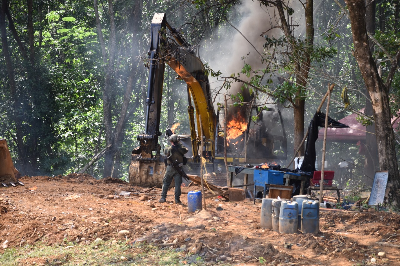 Los componentes de la Fuerza Pública llegaron hasta zona rural del corregimiento de El Jardín, municipio de Cáceres, Antioquia, gracias al llamado que realizaron las Redes de Información, donde se logró la destrucción controlada de varias maquinarias utilizadas para la explotación ilícita de yacimientos mineros. En el sitio fueron destruidos cinco excavadoras, dos unidades de producción minera (UPM), una draga, un motor Mac y demás elementos usados para la explotación ilícita.