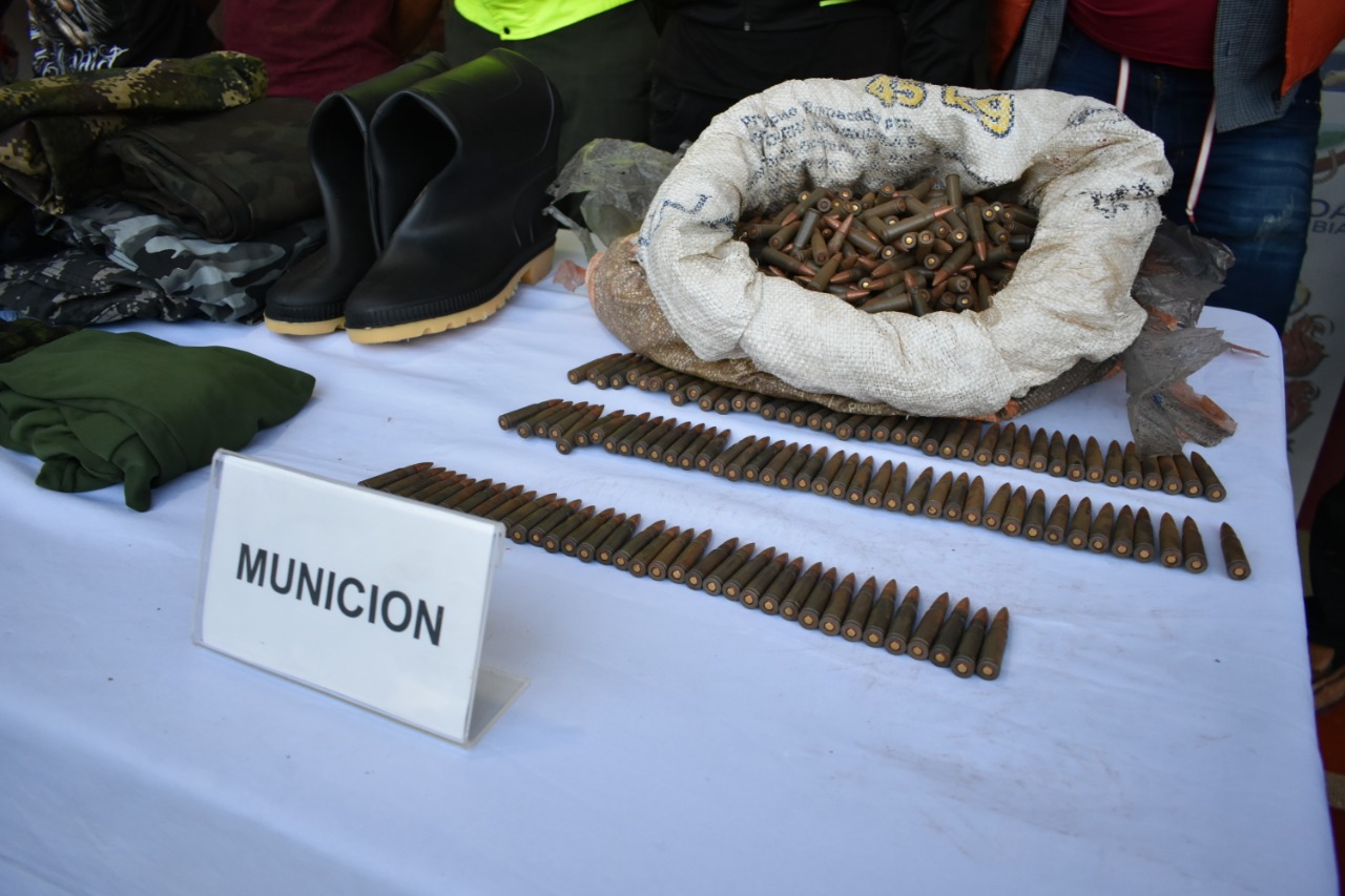 Mediante un trabajo conjunto, coordinado e interagencial entre tropas del Ejército Nacional, Policía Nacional, Fuerza Aérea Colombiana, Armada de Colombia y la Fiscalía General de la Nación, se logró interceptar a estas personas, quienes se desplazaban en cinco motocicletas portando armamento, intendencia, comunicaciones y sanidad, dando como resultado el siguiente material incautado: una pistola, dos proveedores para arma corta, 9 Cartuchos arma corta, 1000 cartuchos calibre 7.62 milímetros, material de comunicaciones, intendencia y fármacos, los cuales serían utilizados para atentar contra la integridad de la población civil y miembros de la fuerza pública.