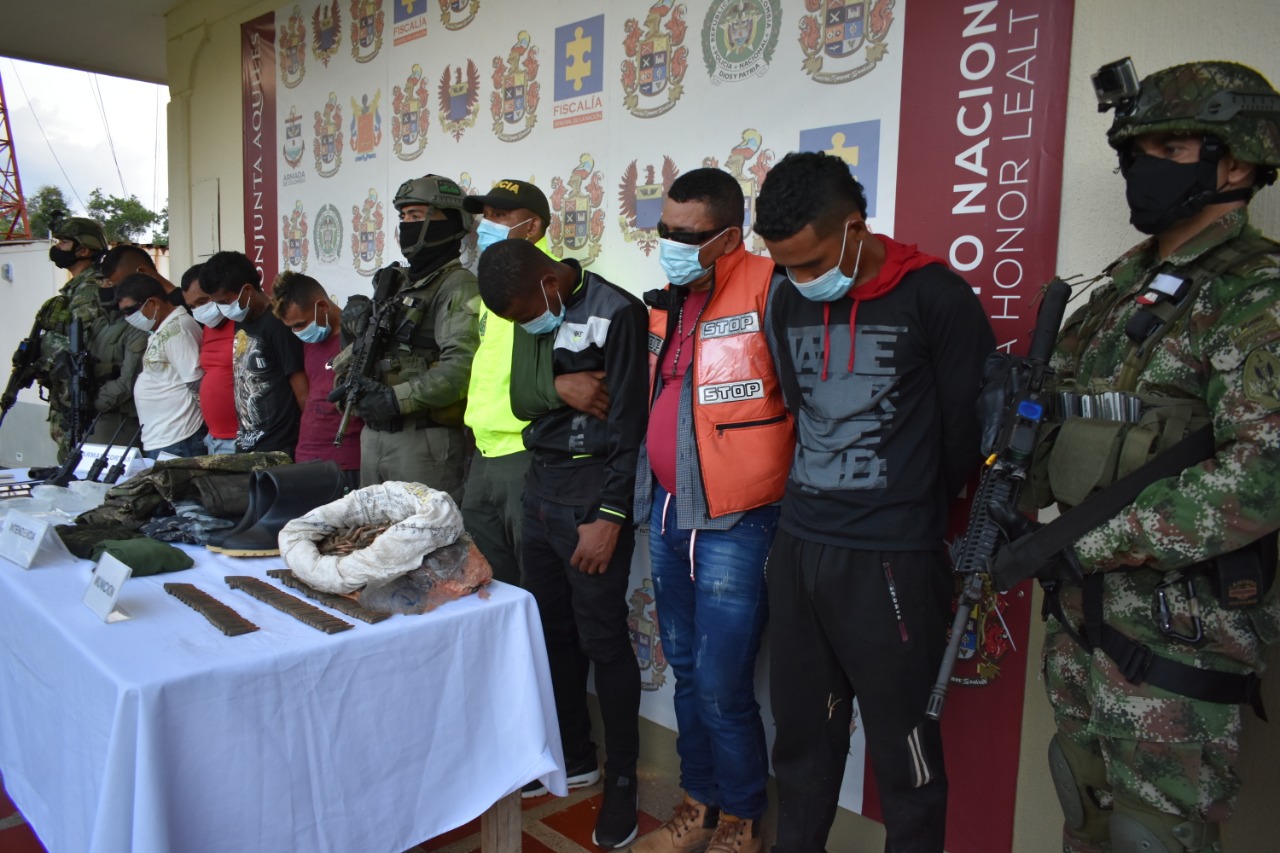 Los ocho sujetos capturados fueron puestos a disposición de la Fiscalía General de la Nación, quienes deberán responder por los delitos de fabricación, tráfico, porte o tenencia de armas de fuego, accesorios, partes o municiones, así como por utilización ilegal de uniformes e insignias.