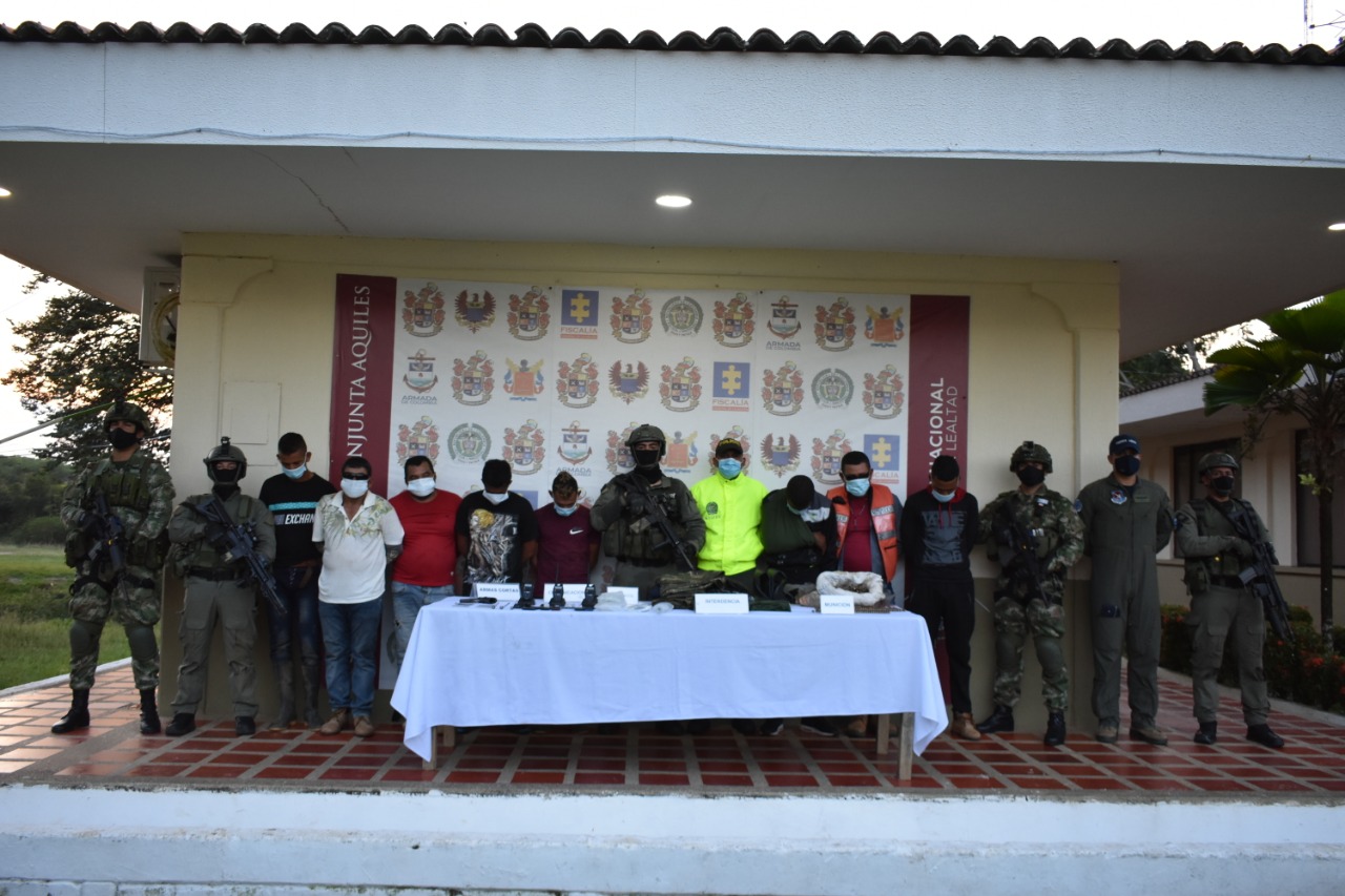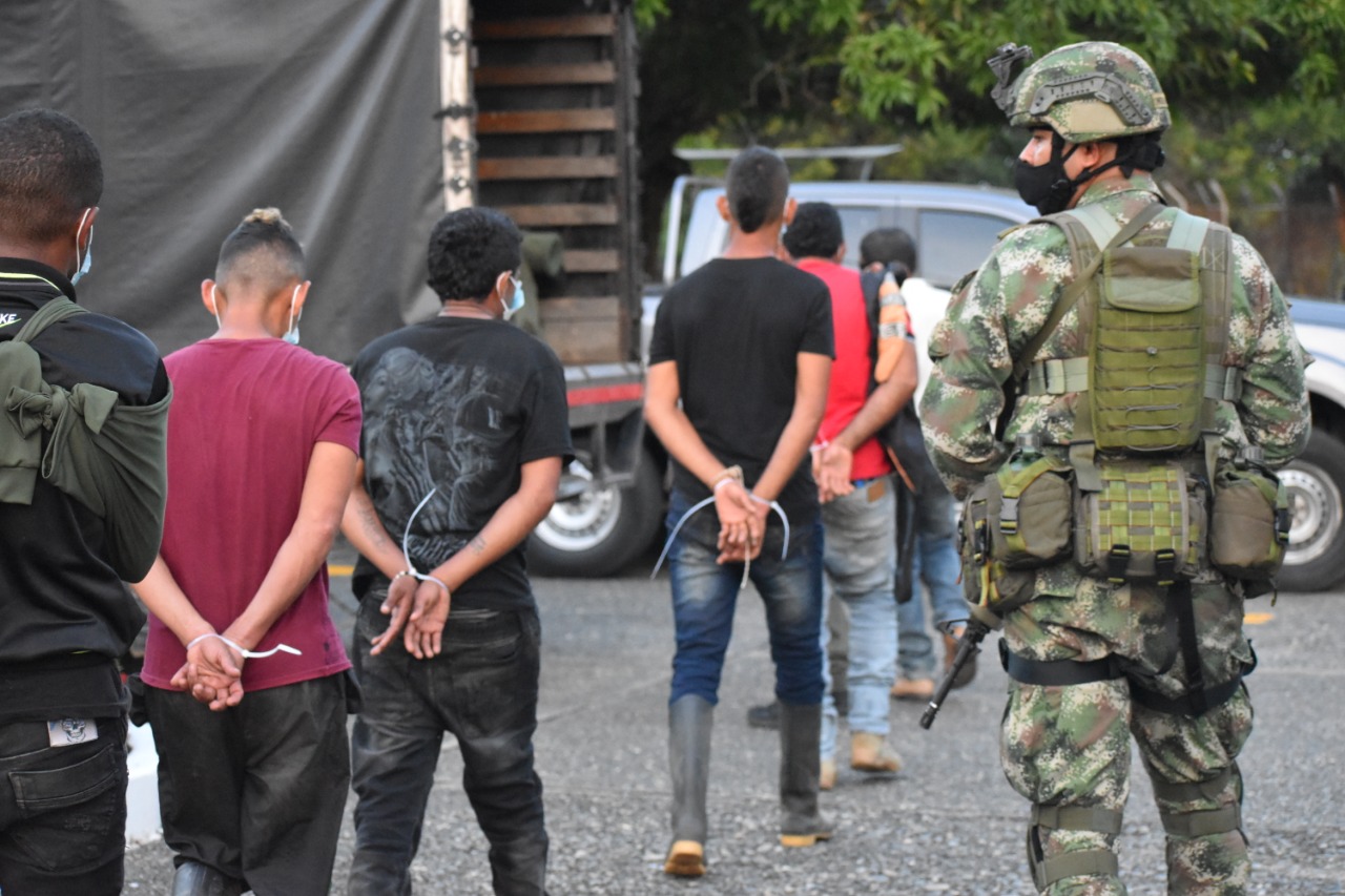 Antioquia. Según información de las autoridades, en atención a las alertas tempranas N°. 003 del 2019 y la 045 del 2020, soldados del Ejército Nacional y policías capturaron en flagrancia a ocho hombres quienes llevaban en su poder material de guerra y comunicaciones. En esta misma operación fue recuperado un menor de edad quien estaría siendo retenido contra su voluntad por el Grupo Armado Organizado Clan del Golfo en el Bajo Cauca antioqueño.